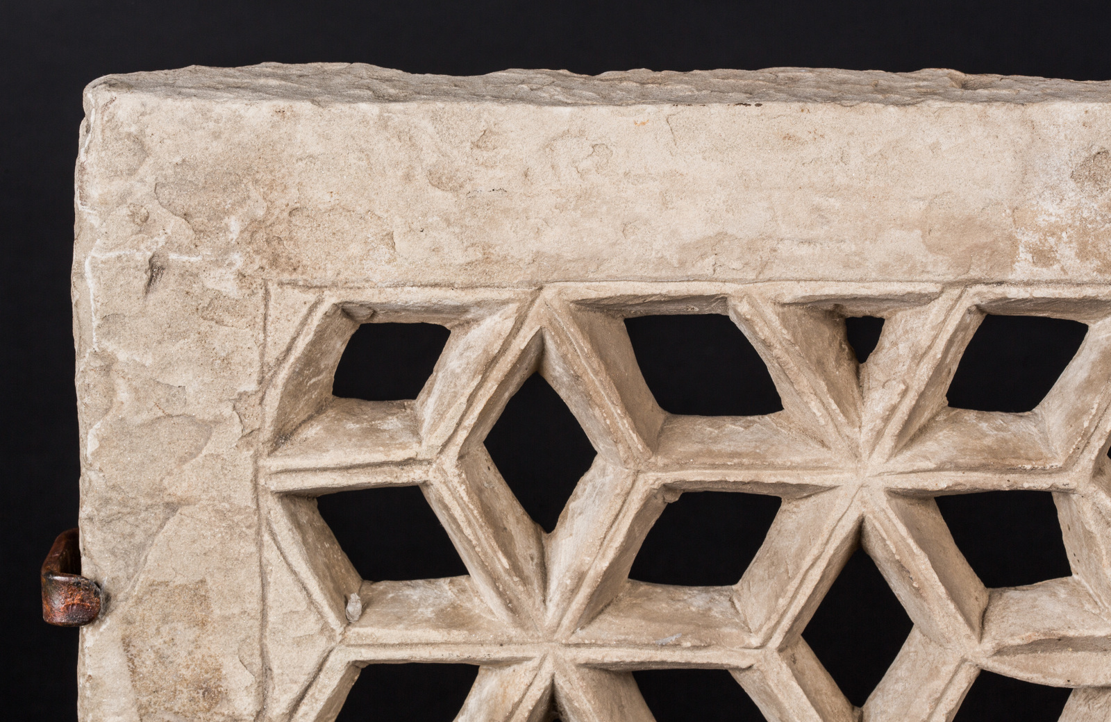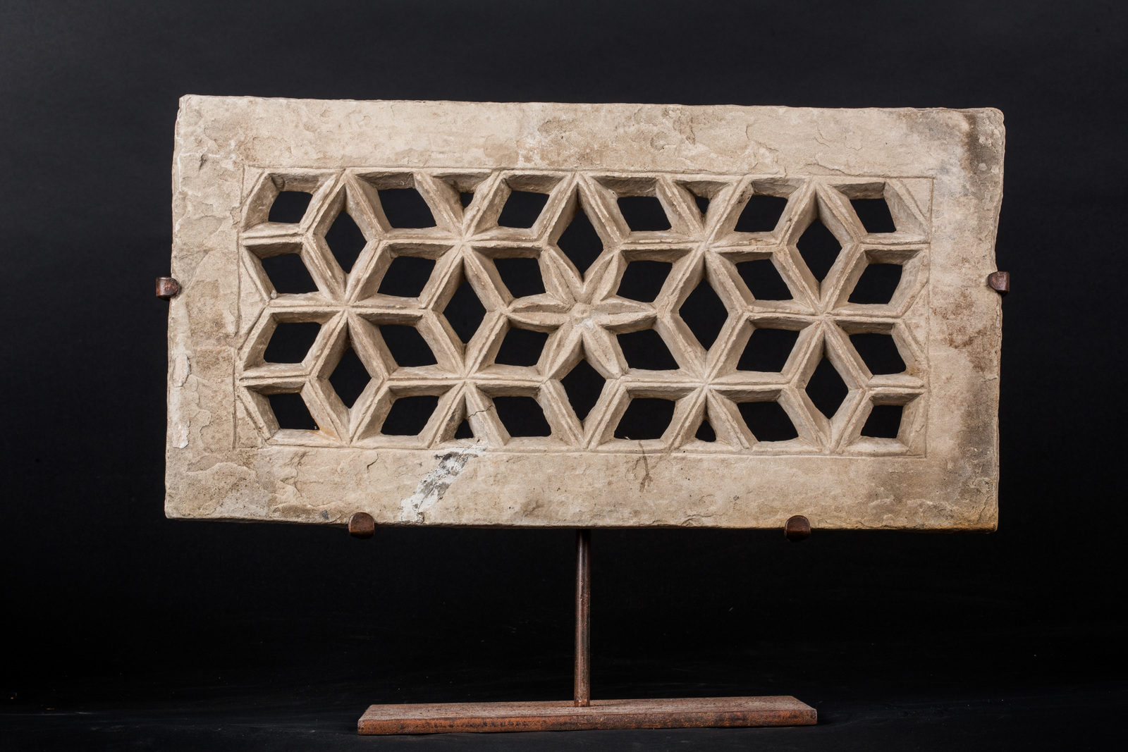 India Mughal, XVIII - XIX secolo. -. Cm 56,50 x 29,00. Di forma rettangolare, lavorato con trafori geometrici e fiore centrale. Pannelli di questo tipo sono elementi architettonici che nascondono le donne dalla visione degli uomini (Purdah).