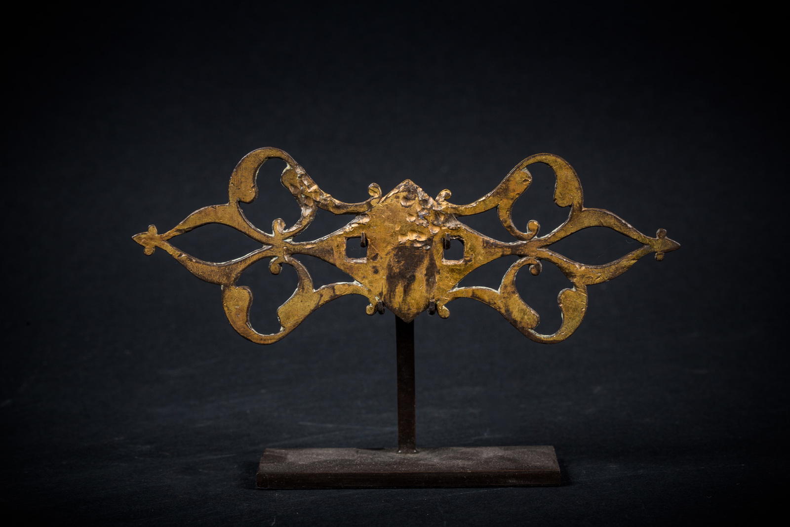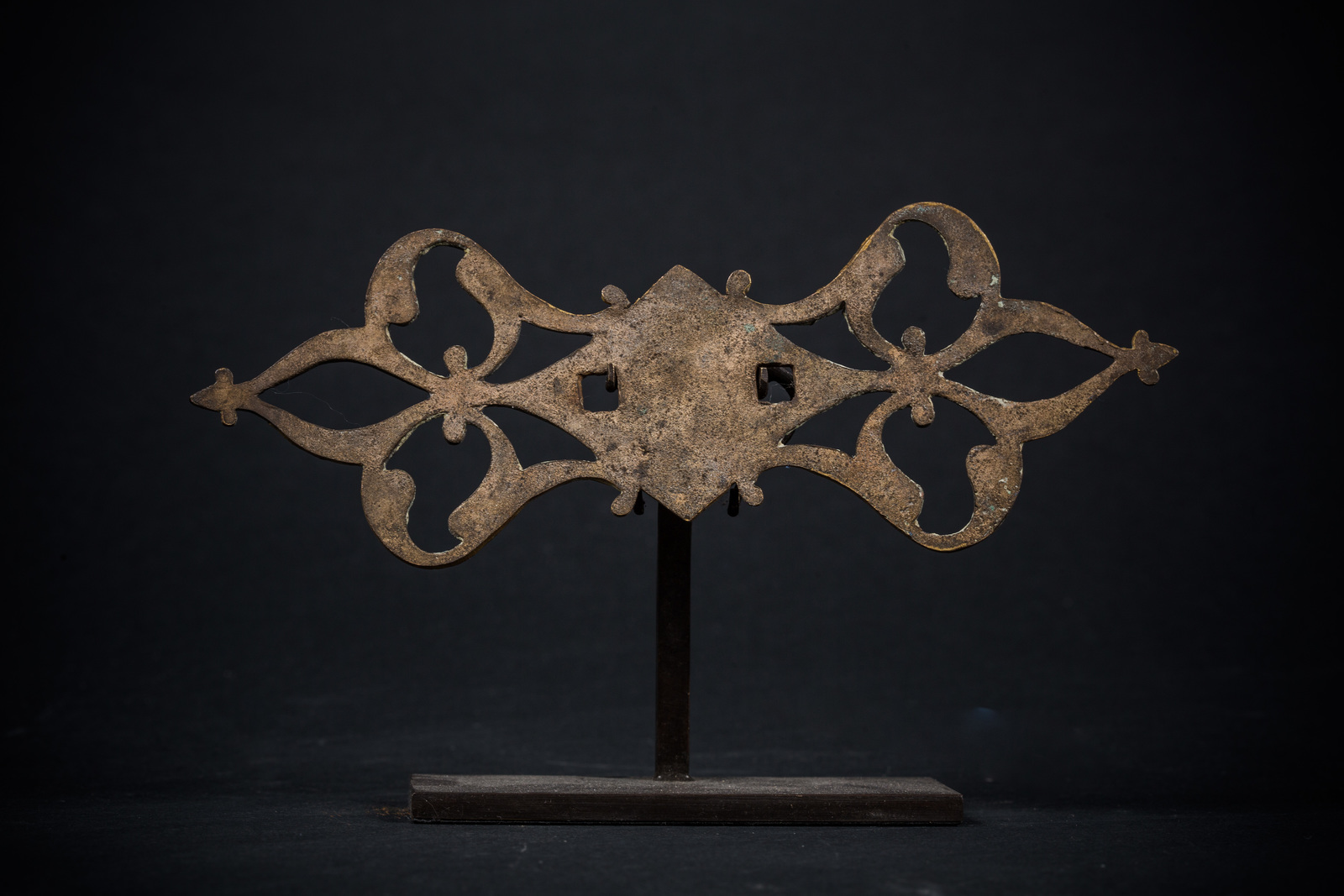 Turchia ottomana, XVI - XVII secolo . -. Cm 18,00 x 6,00. Composto da due palmette affrontate caratterizzate da una decorazione a traforo a motivo vegetale. I due elementi sono uniti da una fascia romboidale nel centro recante due fori nei quali attualmente si situa il supporto.