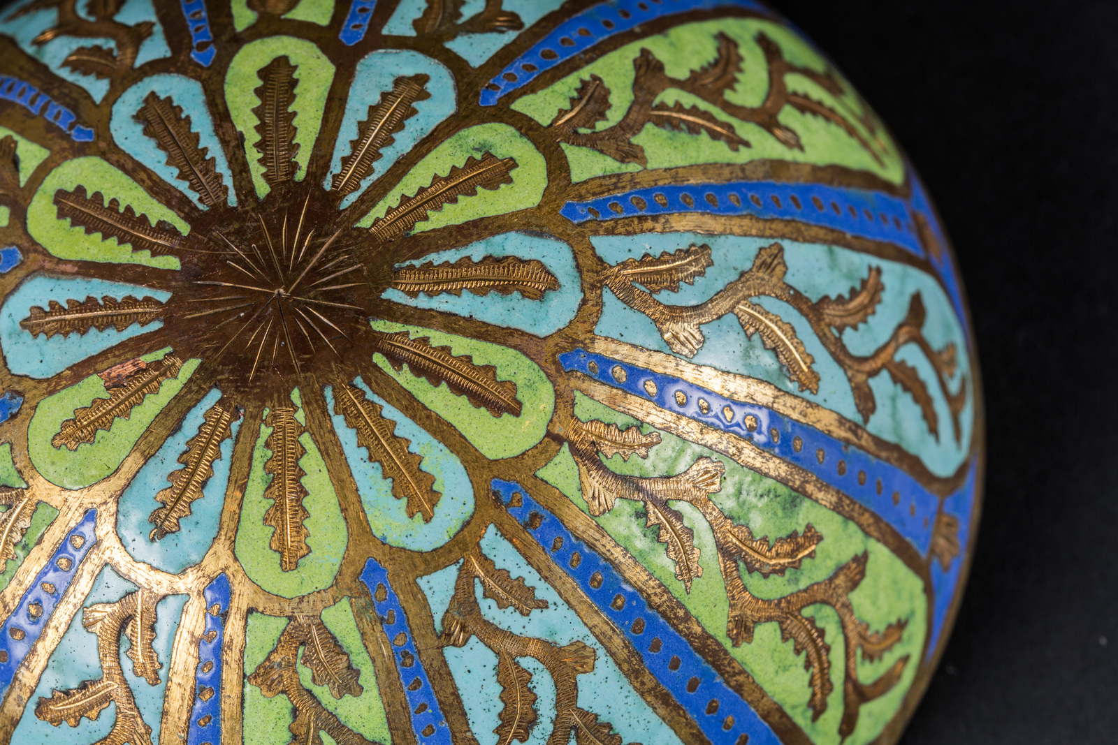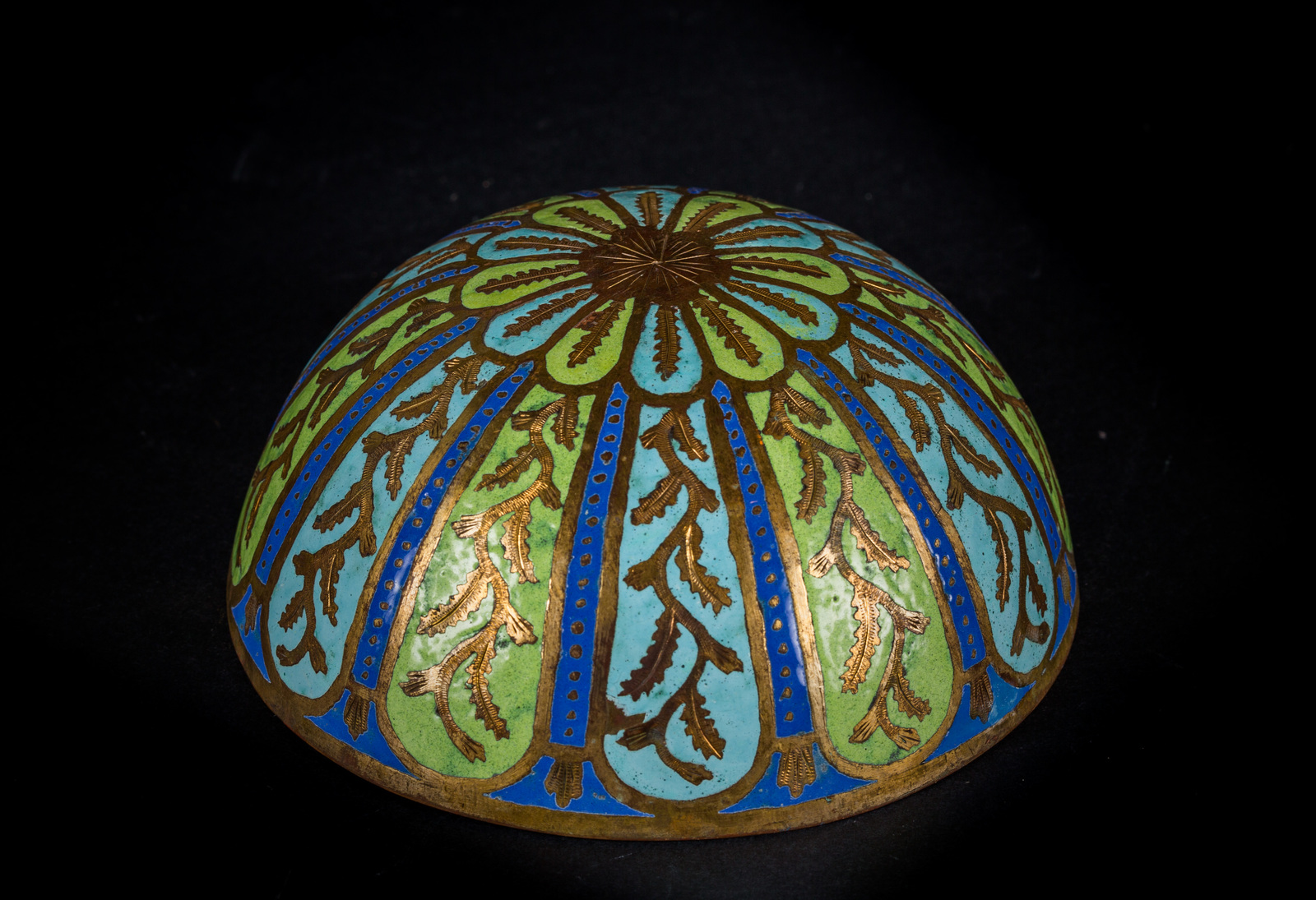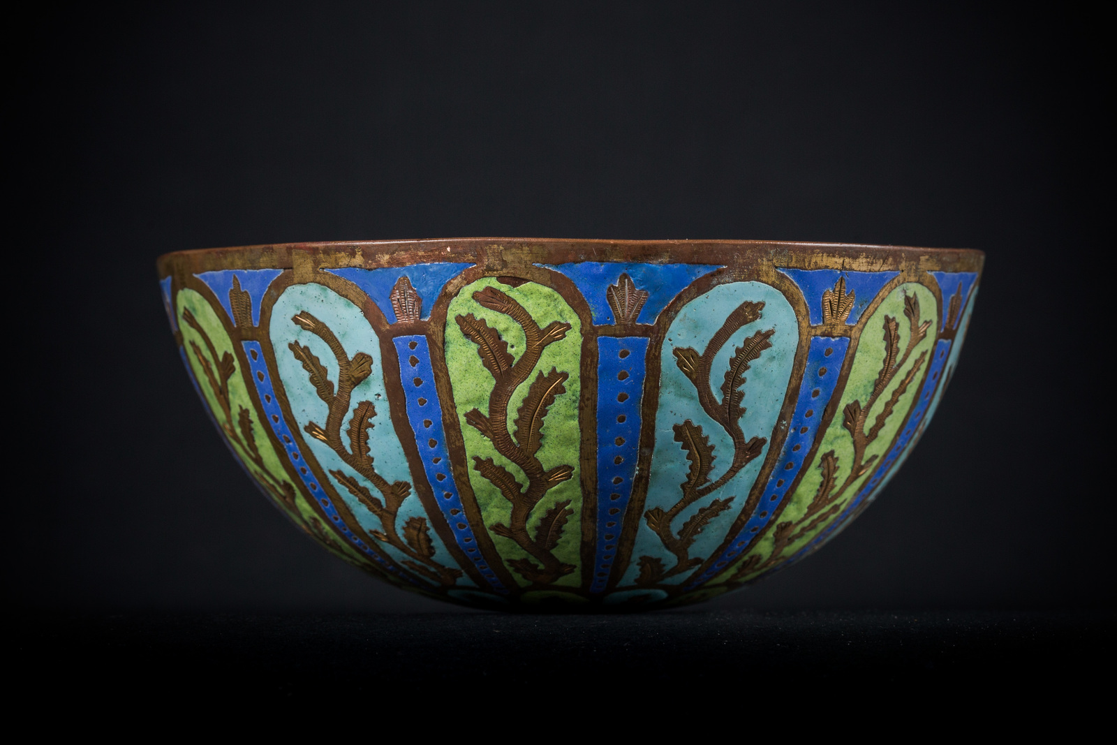Turchia ottomana, XIX secolo . -. Cm 12,50 x 6,00. Coppa in rame dorato, l'esterno smaltato con pannelli radiali verdi e turchesi contenenti elementi vegetali cesellati ed intervallati da interstizi blu.