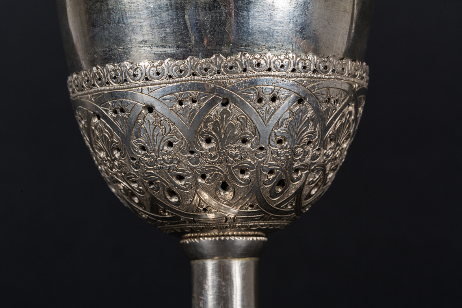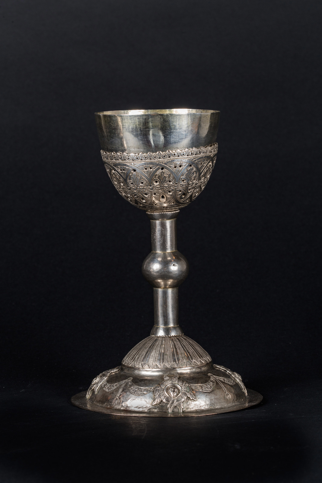 Impero ottomano, XVIII - XIX secolo . -. Cm 16,00 x 24,00. Su base circolare decorata con figure cristiane entro medaglioni delimitate da ali d'angelo ed unite tramite festoni barocchi, zona di raccordo cesellata con foglie d'ispirazione neoclassica, gambo con nodo centrale e doppia coppa con esterno decorativo, lavorato a traforo con motivi vegetali intrecciati.