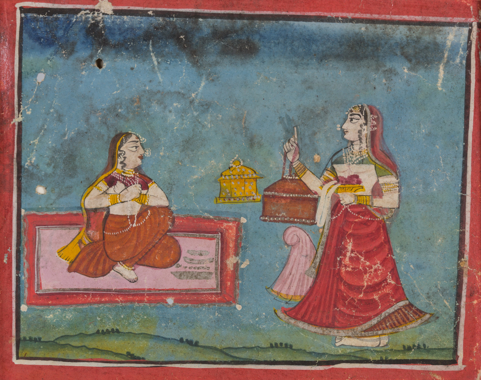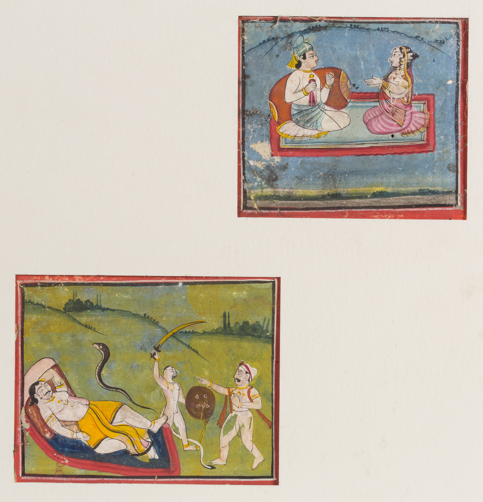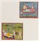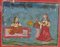 India, Rajasthan, XIX secolo . -. Cm 23,50 x 24,00. Tre piccole miniature: una raffigurante una nobildonna seduta ed un ancella; una raffigurante una coppia seduta su un tappeto e l'ultima raffigurante un episodio del Ramayana.