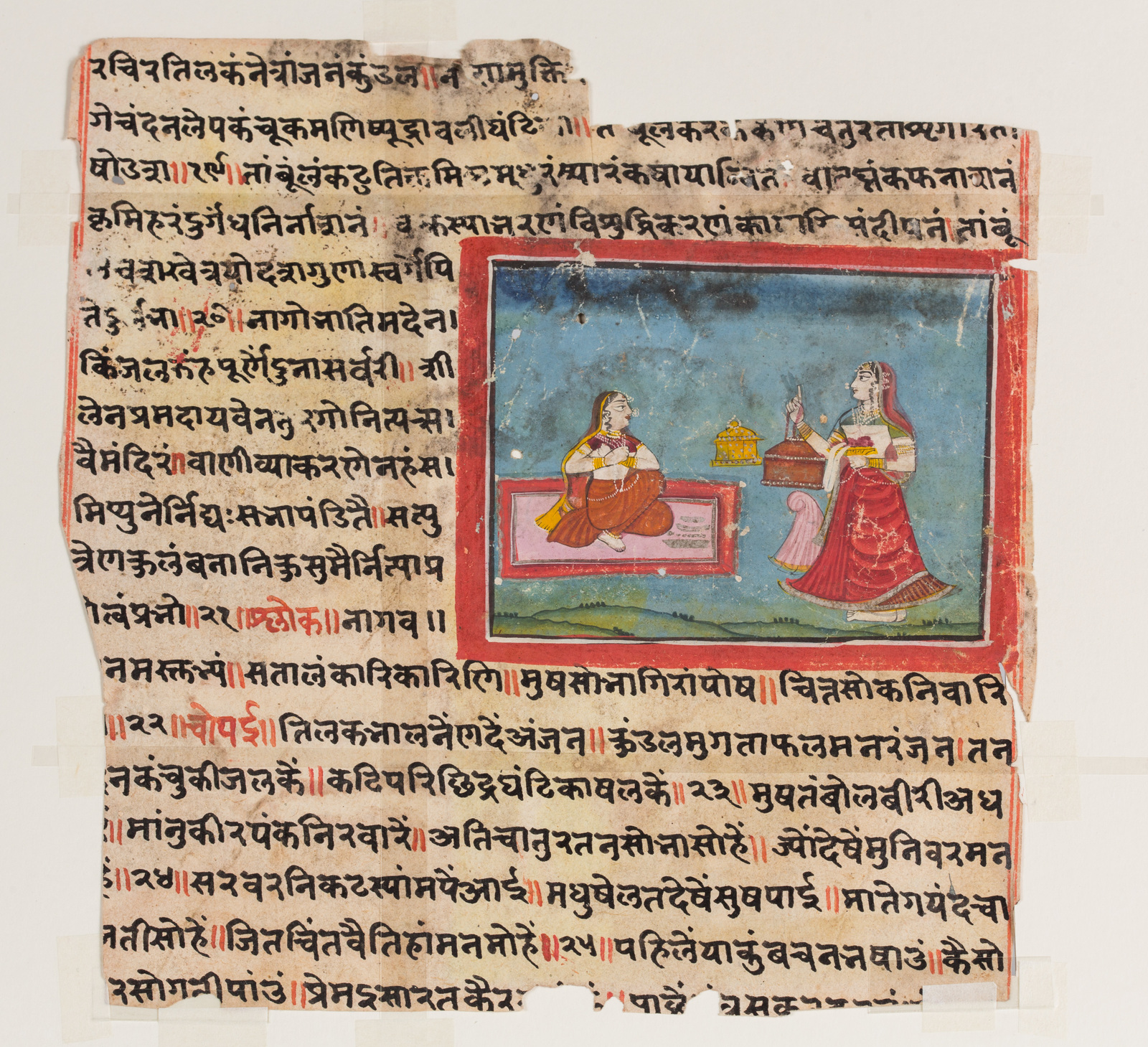 India, Rajasthan, 19th century . . Cm 23,50 x 24,00. Three miniatures depicting: a lady and her maid; a couple and a passage from the Ramayana.