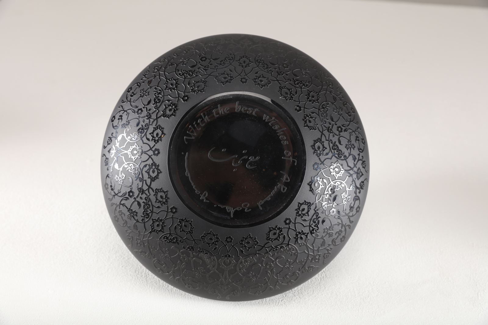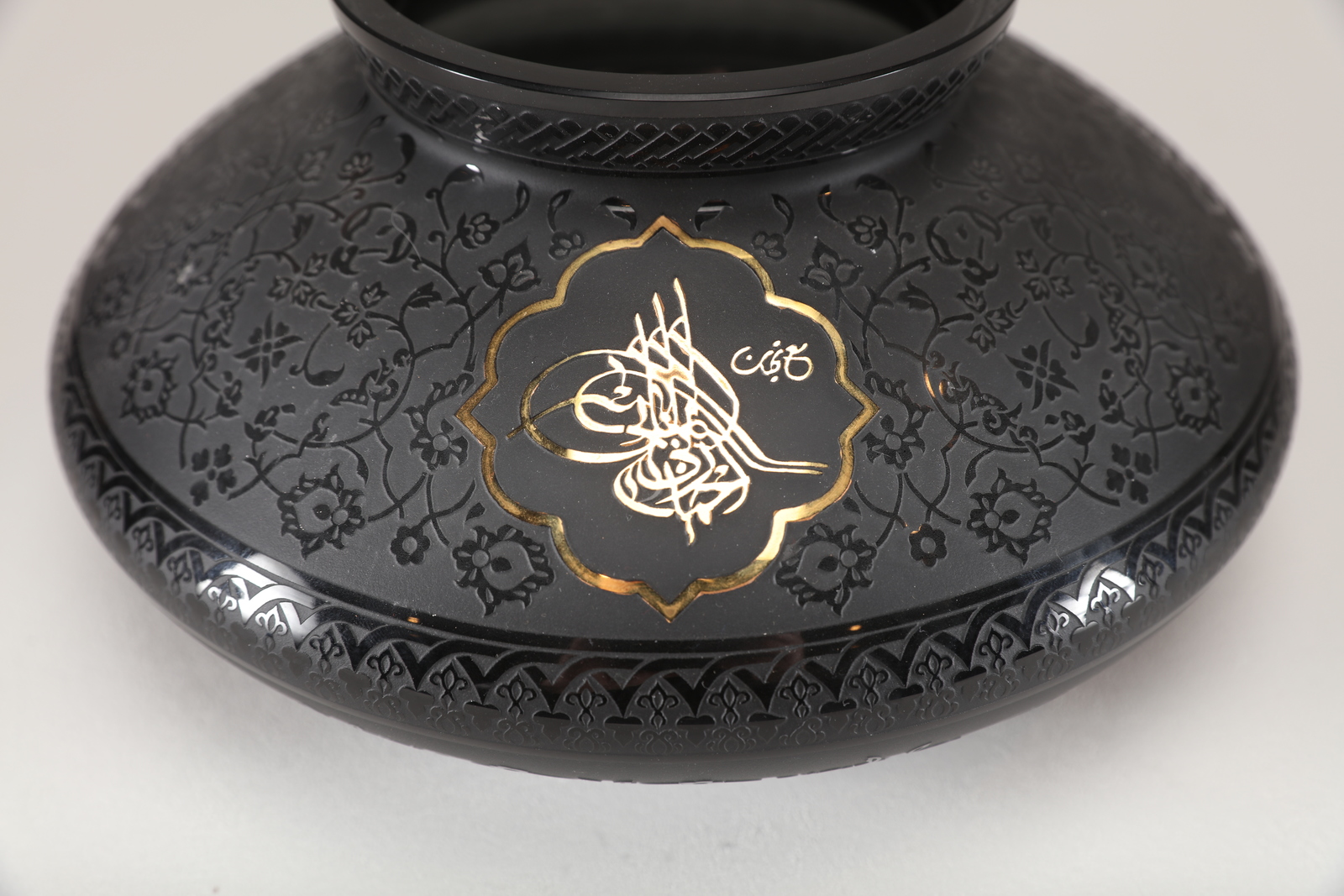 Islamic Art A glass bowl decorated with pseudo tughra and arabesques and bearing an incised dedication and the artist's signature Ahmad Mohammad at the base Europe for Turkey, late 19th century . . Cm 22,00 x 13,00.