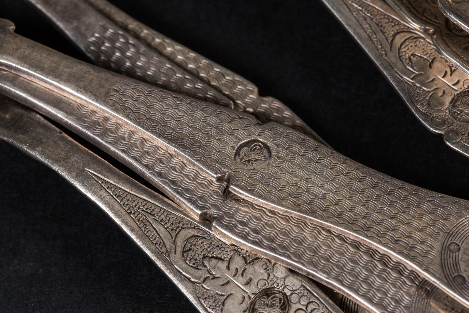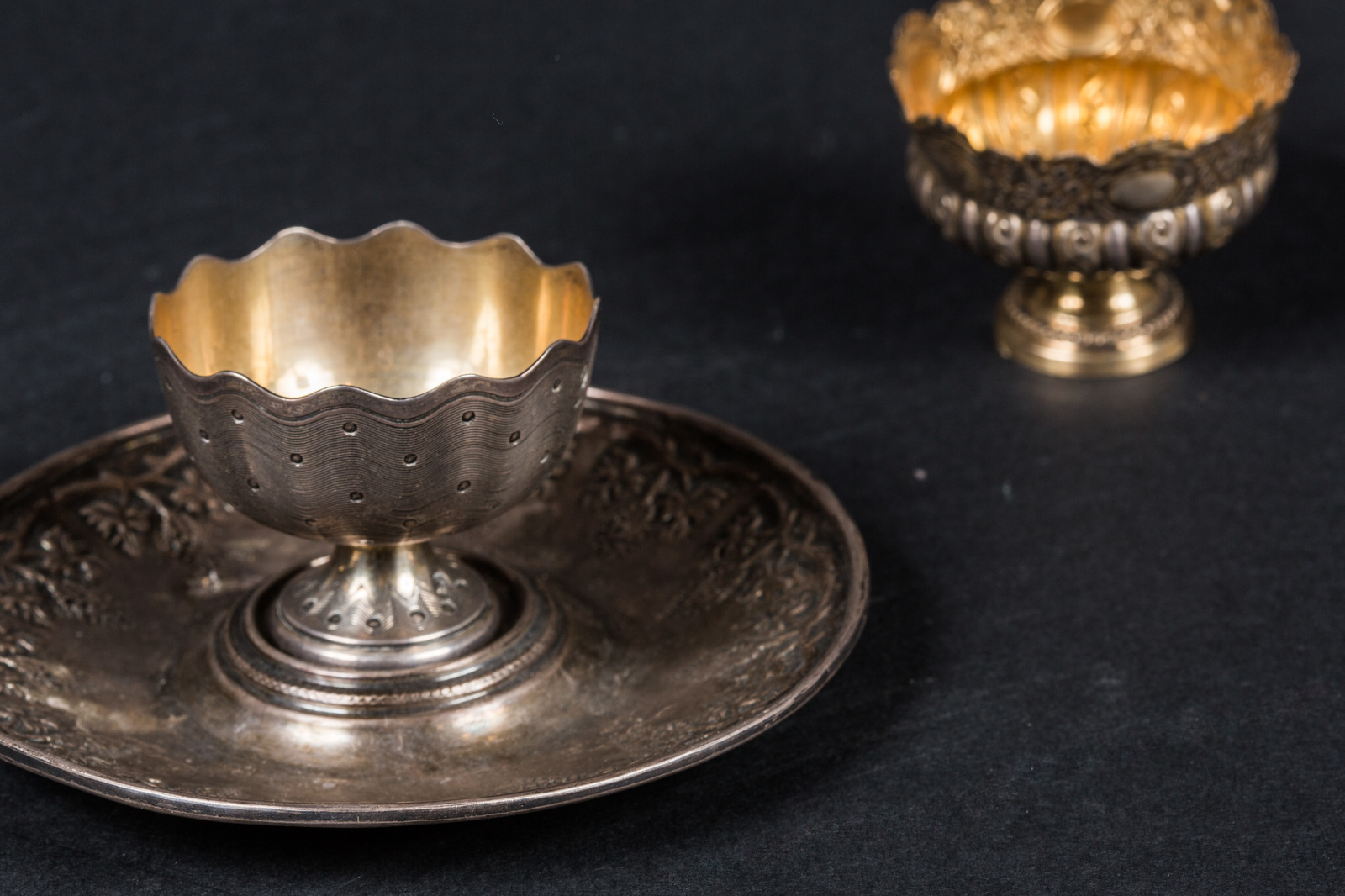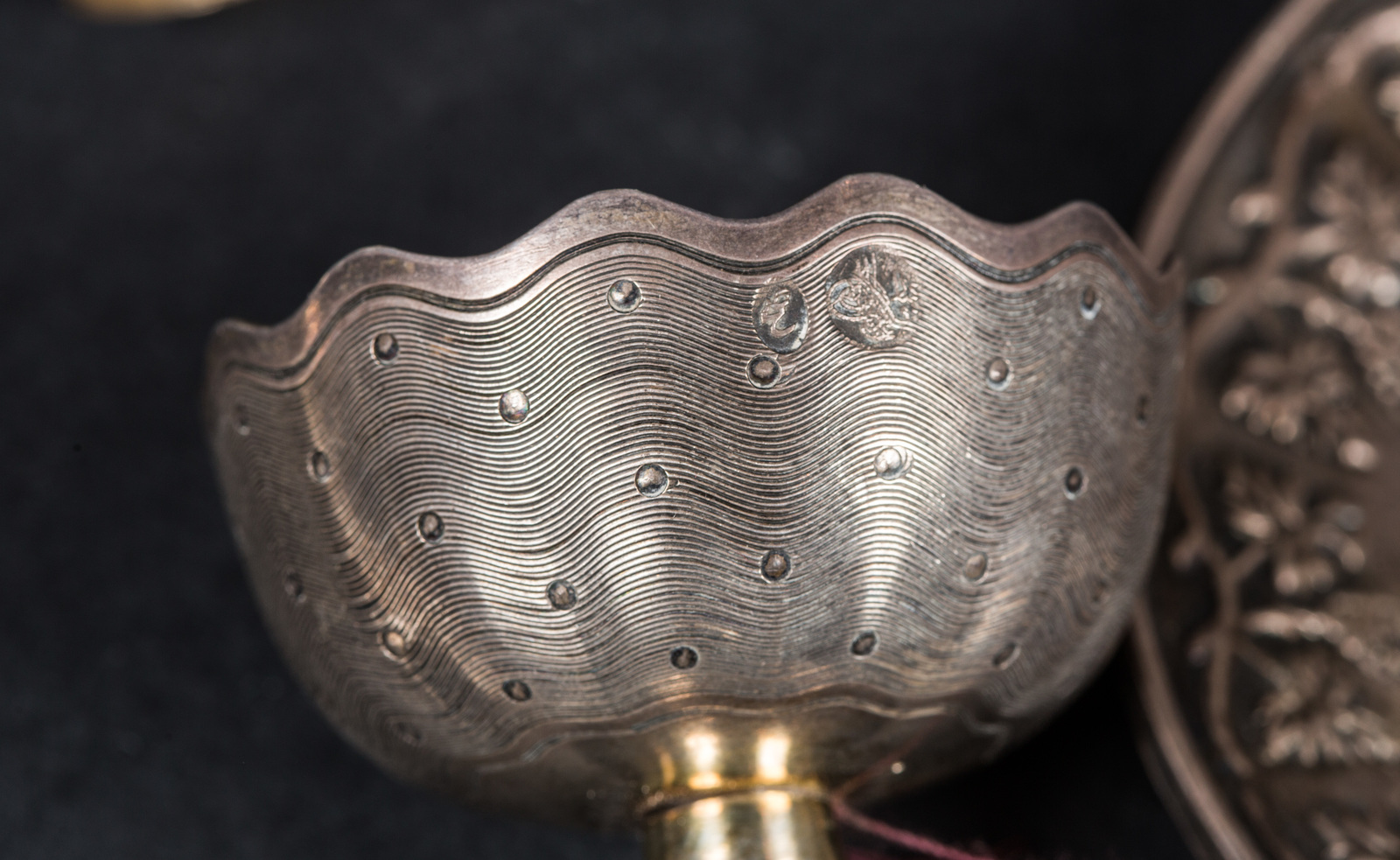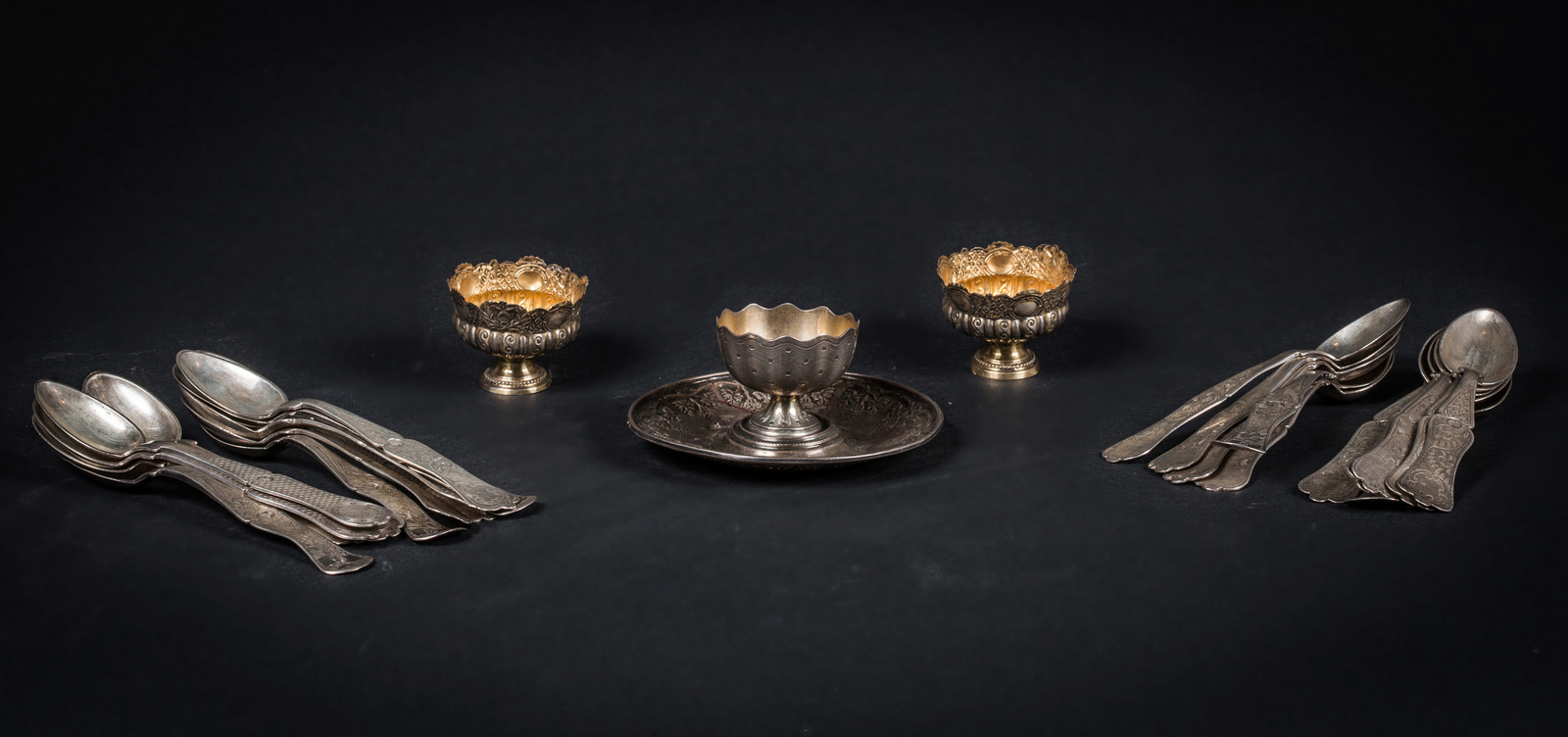 Ottoman Turkey, 19th century . . . Set of 23 spoons, w. 16,5 cm avarage; a zarf with saucer (diam. 11,5 cm) and a pair of zarfs h. 4,2 cm (within box).
