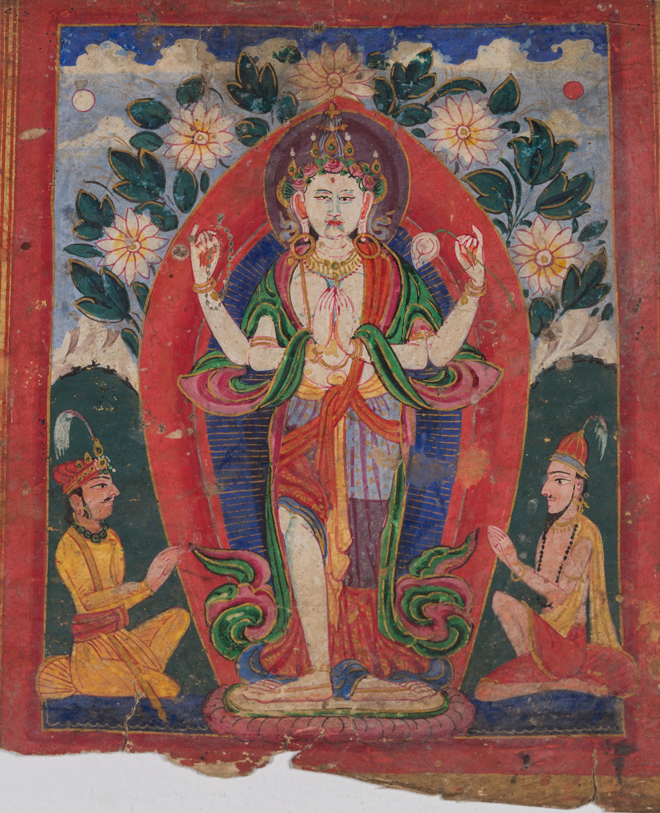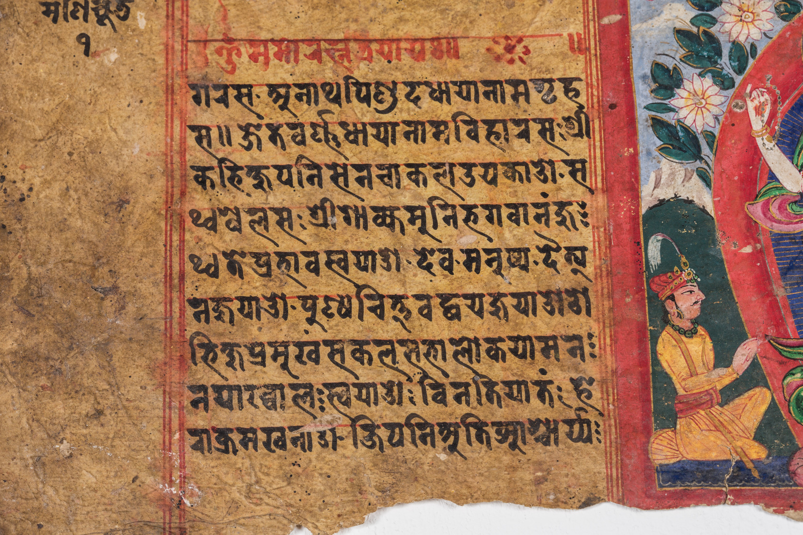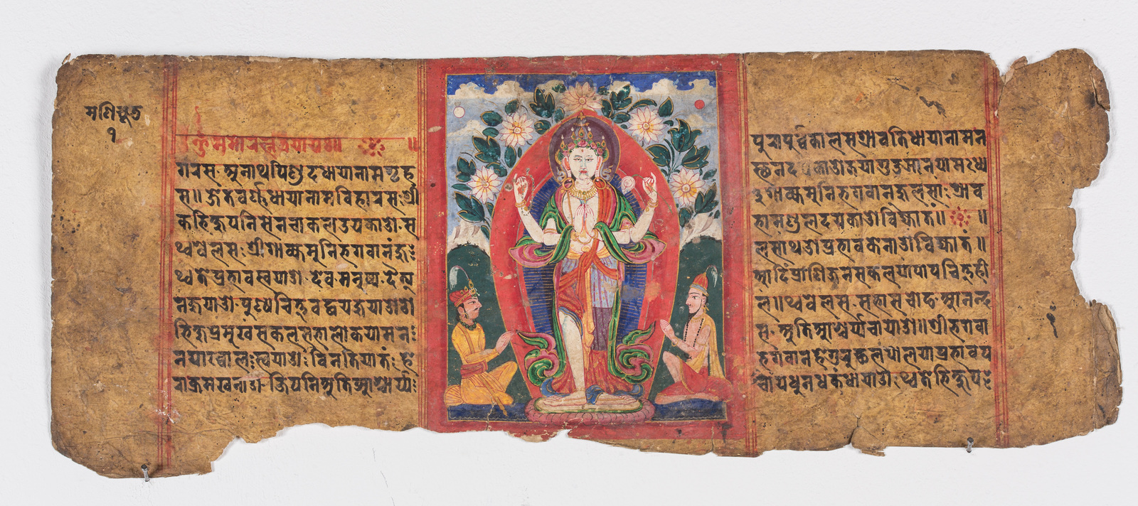 India, XVIII secolo . -. Cm 15,00 x 39,50. Testo in devanagari, manoscritto in inchiostro nero con titolo in rosso, disposto su due colonne di dieci righe. La miniatura raffigura il bodhisattva della compassione nella forma di Chenrezig in postura stante fiancheggiato da due personaggi oranti, dai tratti somatici indiani, probabilmente i committenti.