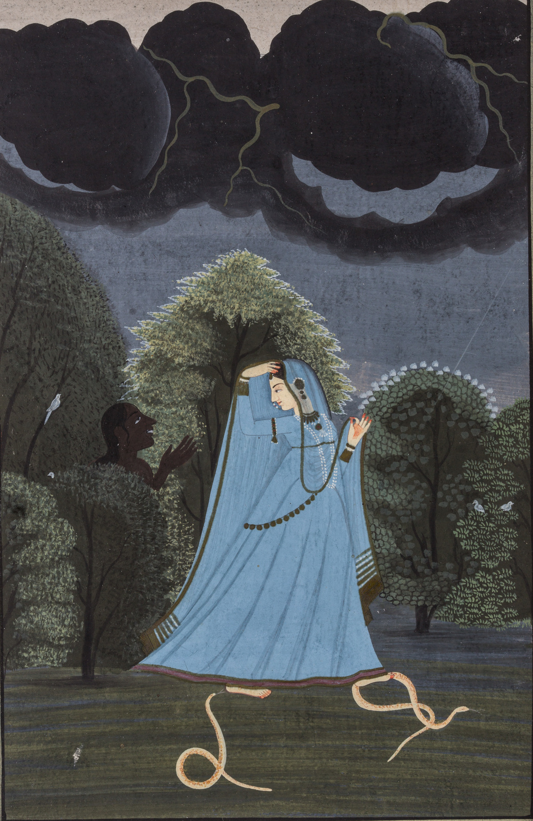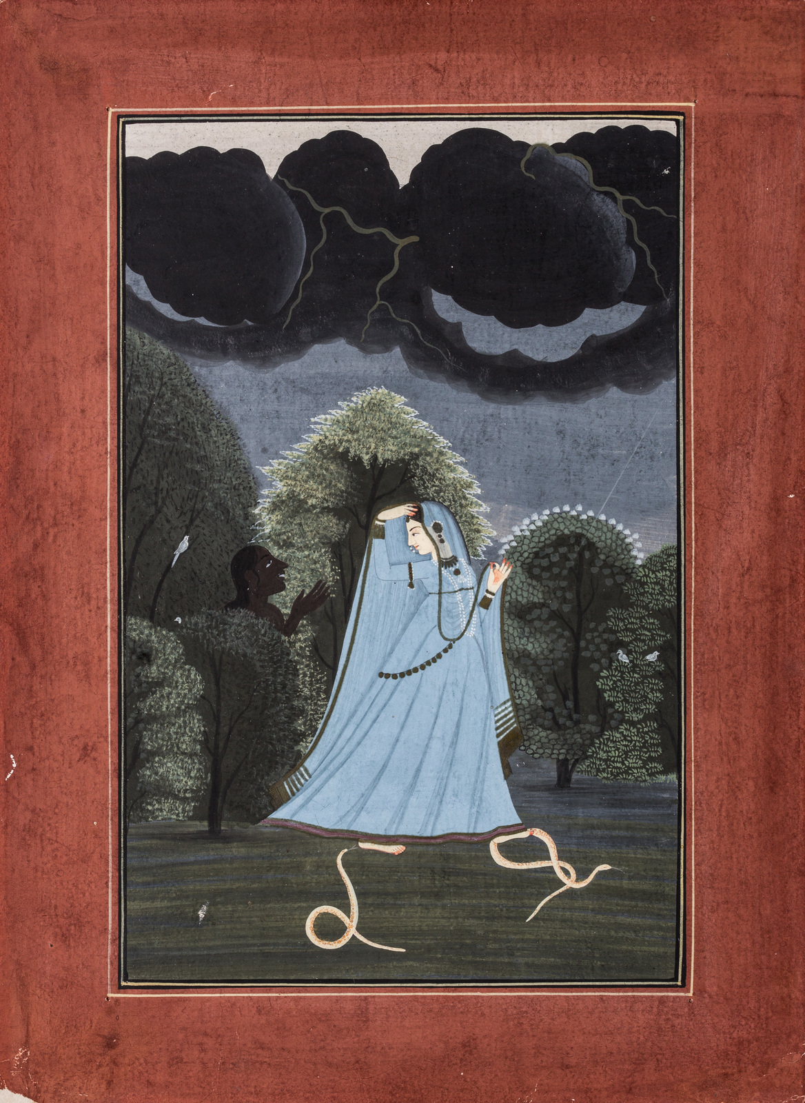 Arte Indiana Miniatura raffigurante Abhisarika Nayika che incontra una strega e dei serpenti sulla strada per incontrare l'amante