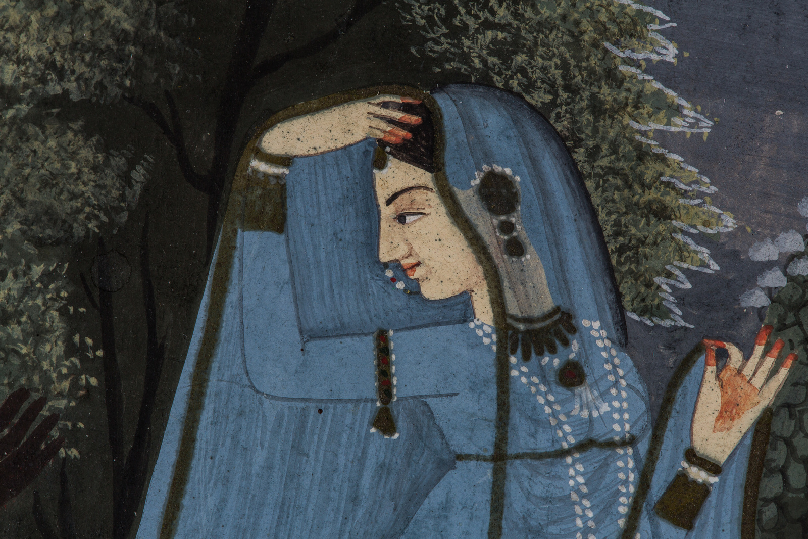 Arte Indiana Miniatura raffigurante Abhisarika Nayika che incontra una strega...