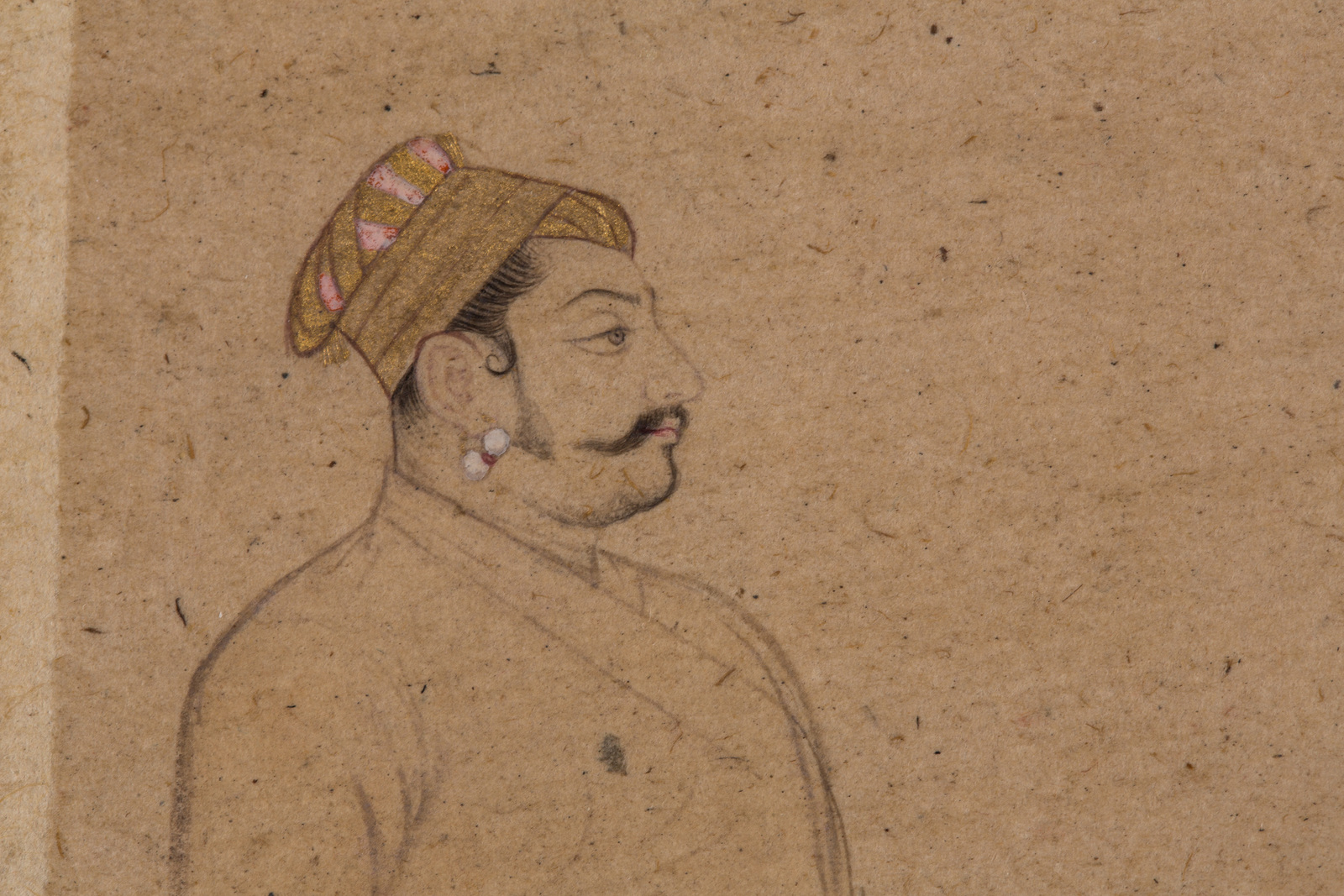 Arte Indiana Disegno raffigurante un nobile seduto India, Rajasthan, XVIII-XIX secolo . . Cm 10,00 x 14,50. Su uno sfondo incolore spicca il disegno, lumeggiato in oro e con tocchi di colore, raffigurante un nobile seduto, caratterizzato dal pugnale a spinta nella cintola, orecchino di perle e copricapo dorato. Cornice con polvere d'oro, iscrizioni in devanagari e persiano sul retro; quest'ultima iscrizione identifica il soggetto con il nome di Konur Kupal.