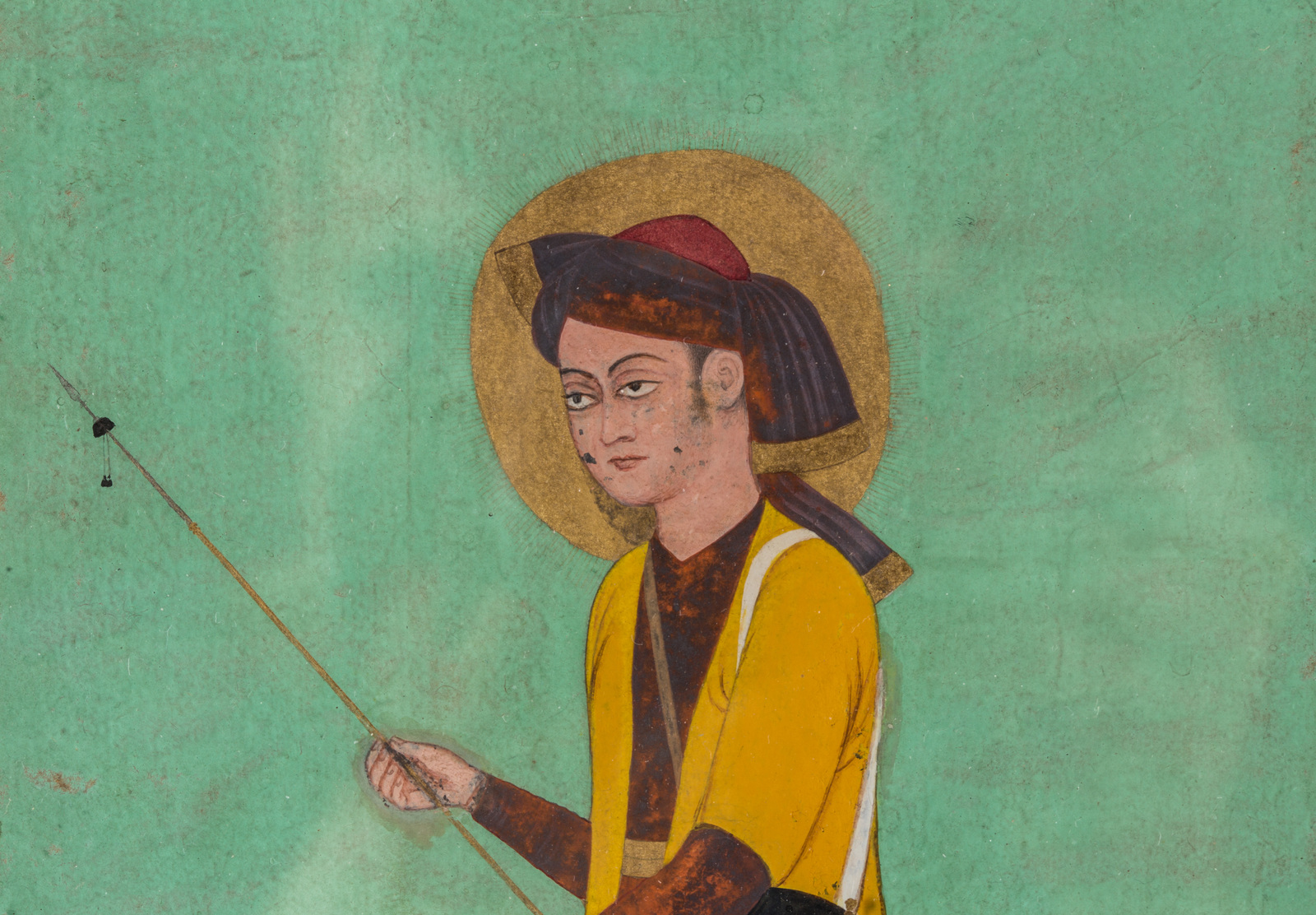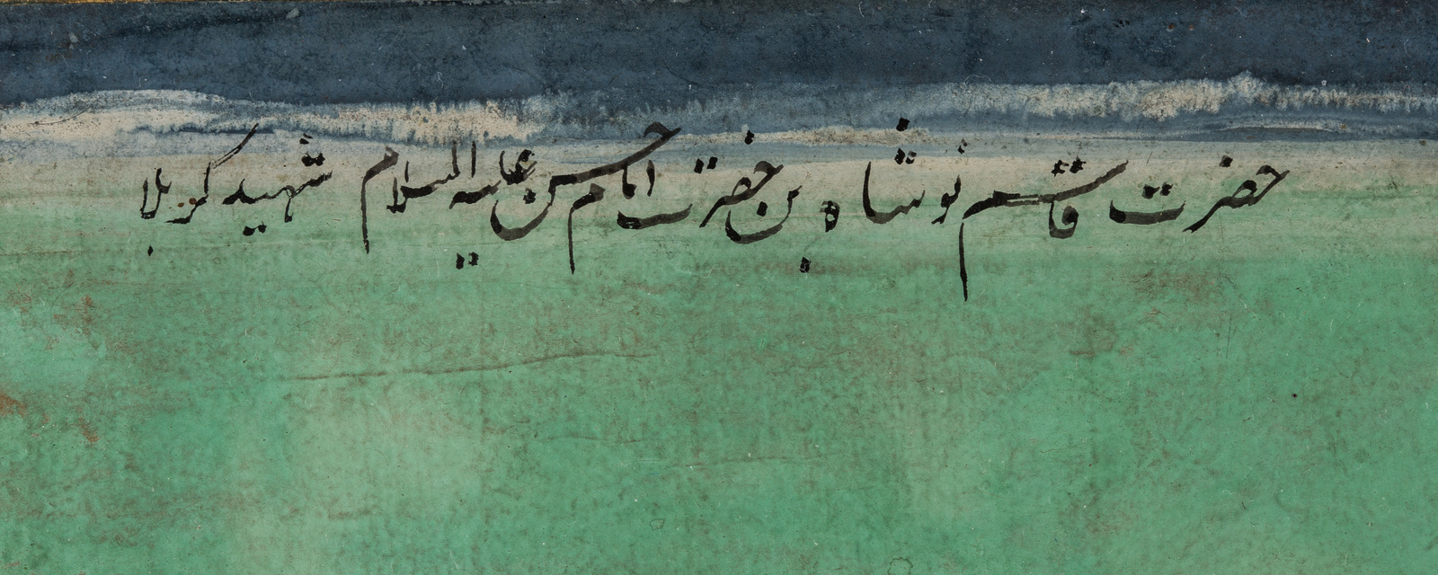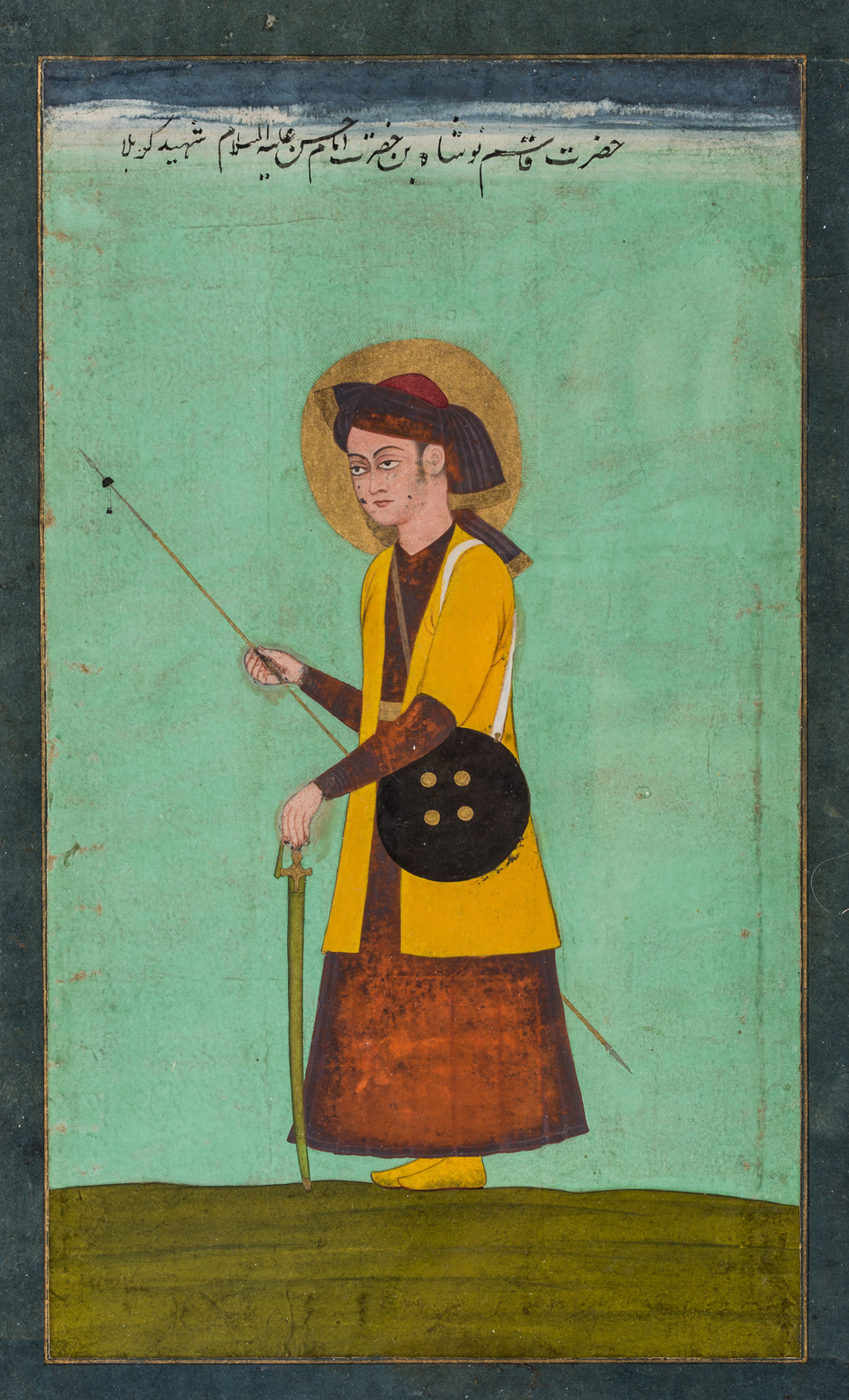 India, XIX secolo . -. Cm 18,00 x 29,50. Su uno sfondo monocromo verde acqua si staglia la silhouette di un ragazzo con aureola dorata, scudo e spada che lo identificano come personaggio di alto rango. Un'iscrizione in persiano nella porzione superiore del dipinto lo identifica come Ghasem, figlio di Hosein (Shahid Karbala).