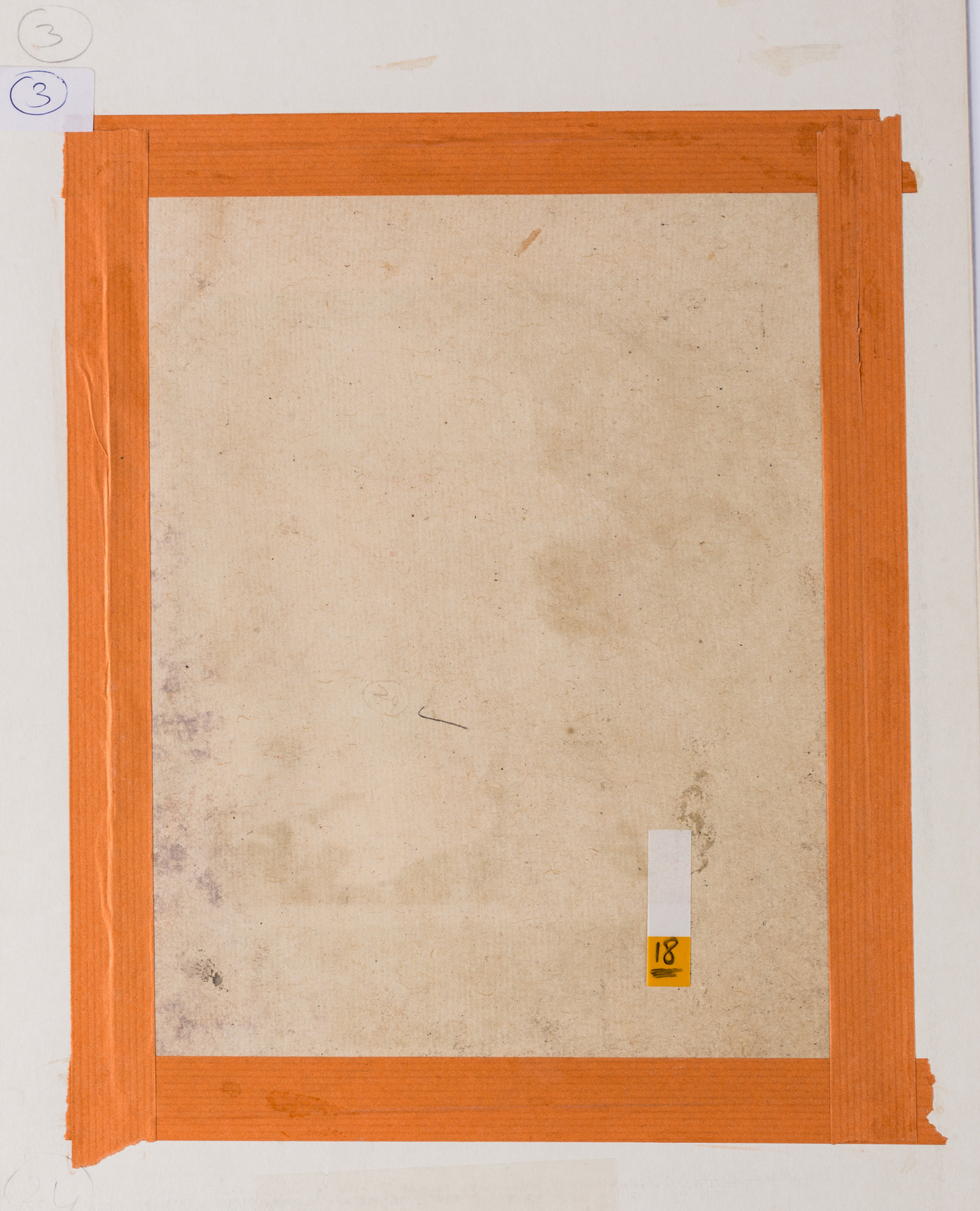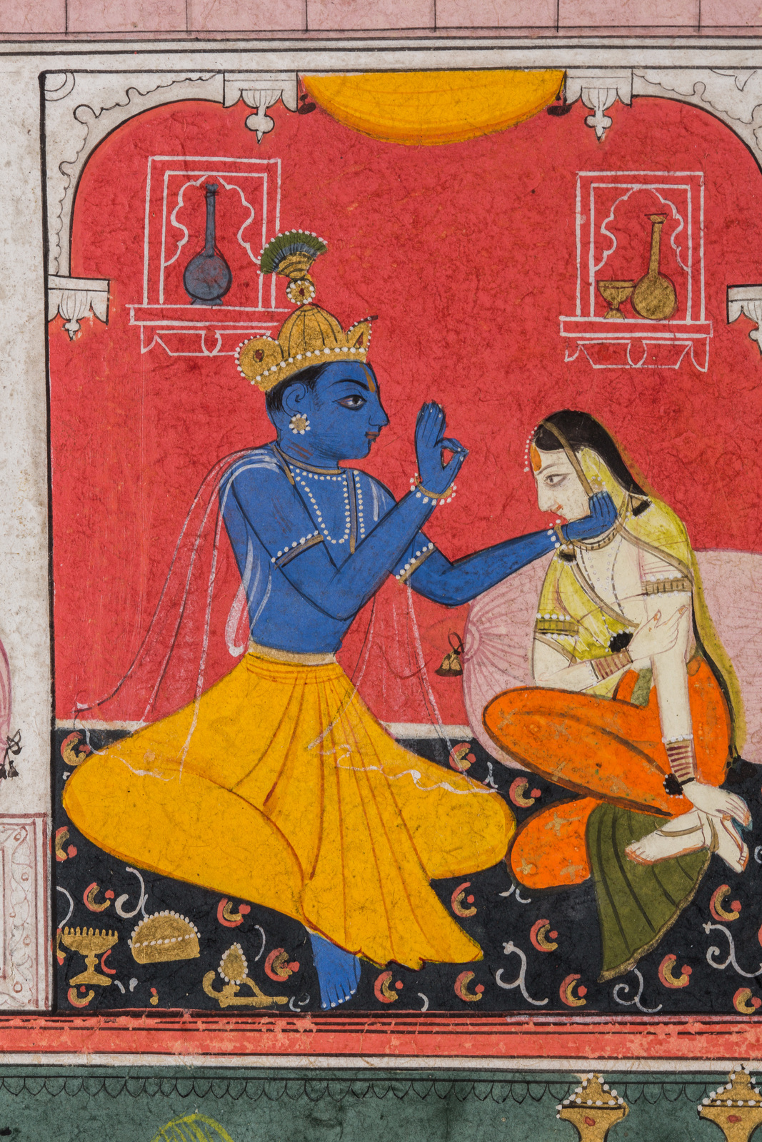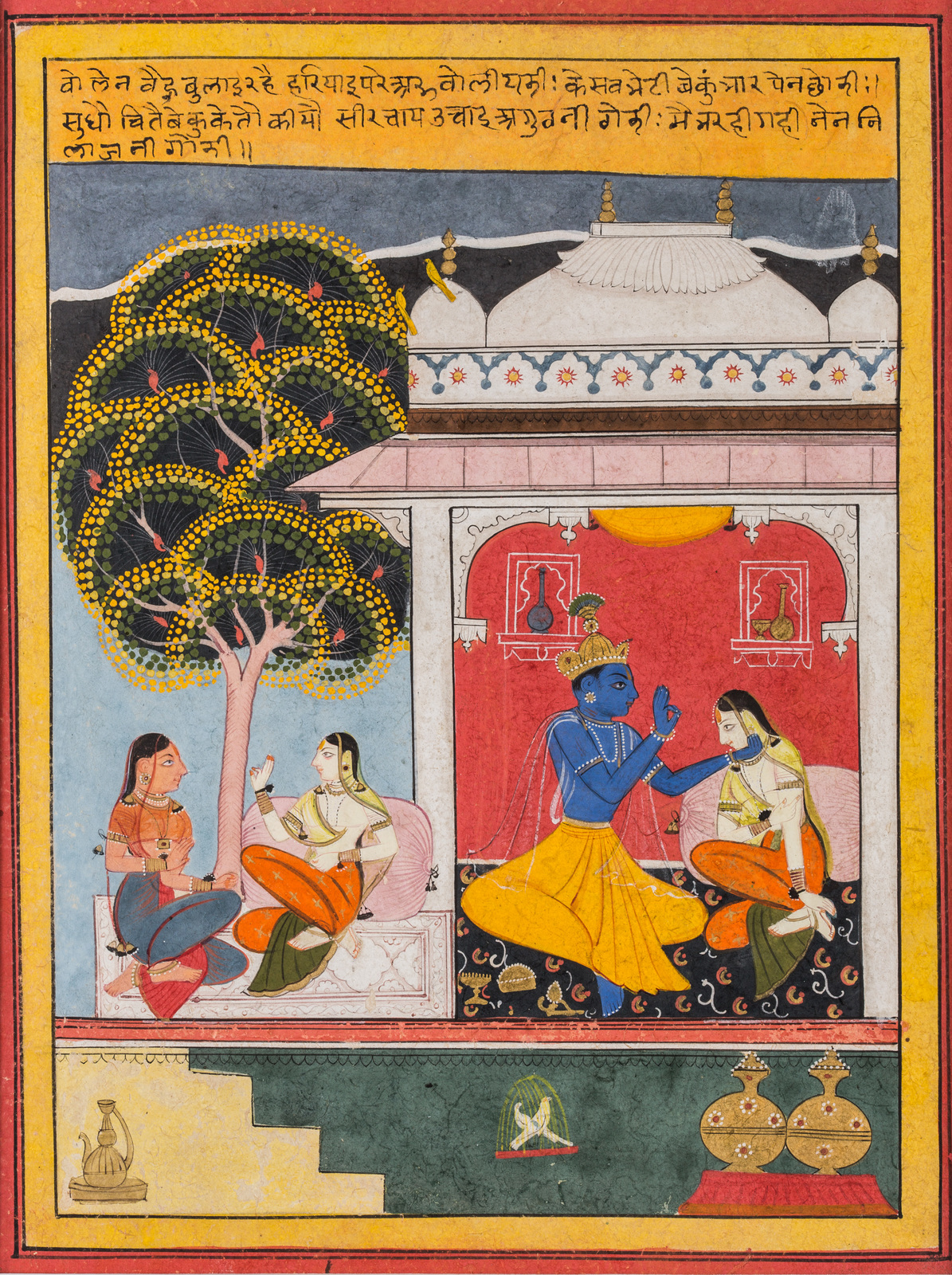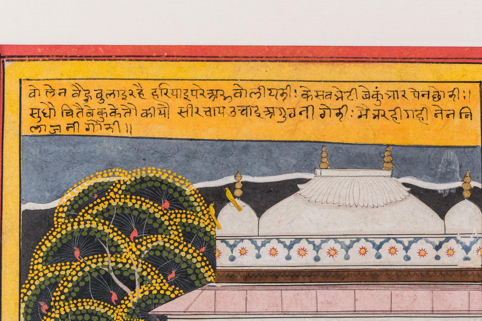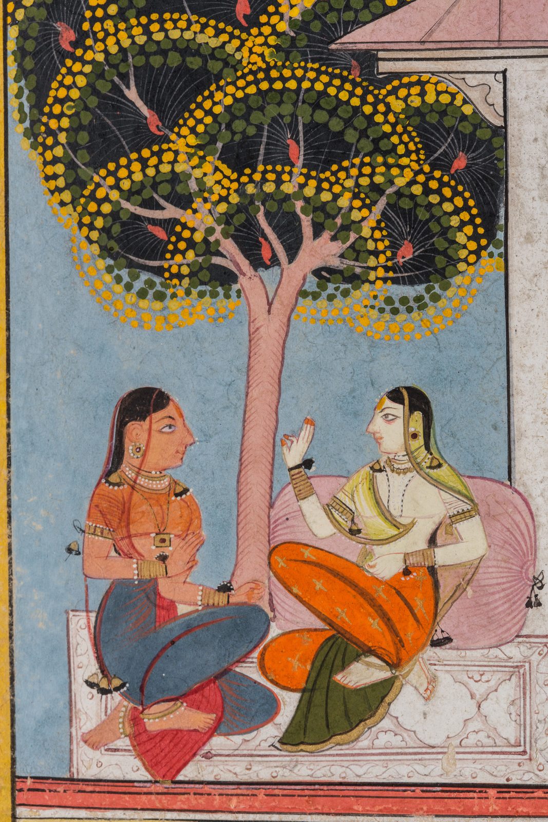 Colori naturali ed oro su carta . . Cm 25,50 x 20,00. Raffigurante la stessa protagonista femminile in due sequenze temporali: a destra ritratta mentre ascolta Krishna all'interno di un palazzo, a sinistra mentre parla con un'ancella sotto un albero. Tre righe di testo in devanagari in alto. Lo stile della raffigurazione è tipico della scuola di Mewar del XVII secolo, ma questa produzione potrebbe essere più tarda.