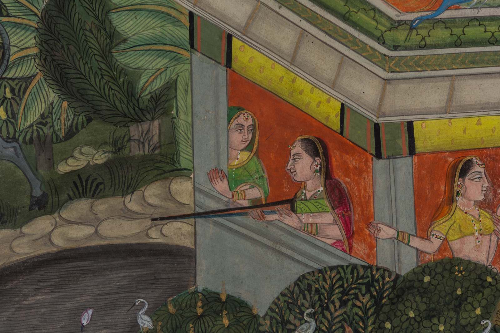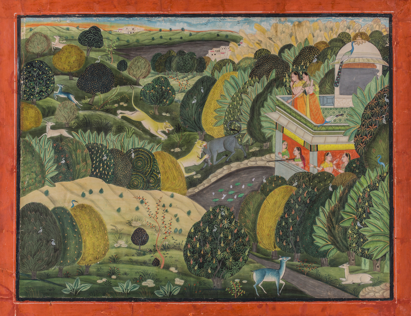 Rajasthan, Kotah, XIX secolo . -. Cm 56,00 x 44,00. Scena di caccia tipica dello stile di Kotah nel soggetto, come nella resa pittorica. Sorprendentemente ad essere impegnate nella battuta di caccia sono delle donne radunate nell'edificio a destra della rappresentazione.