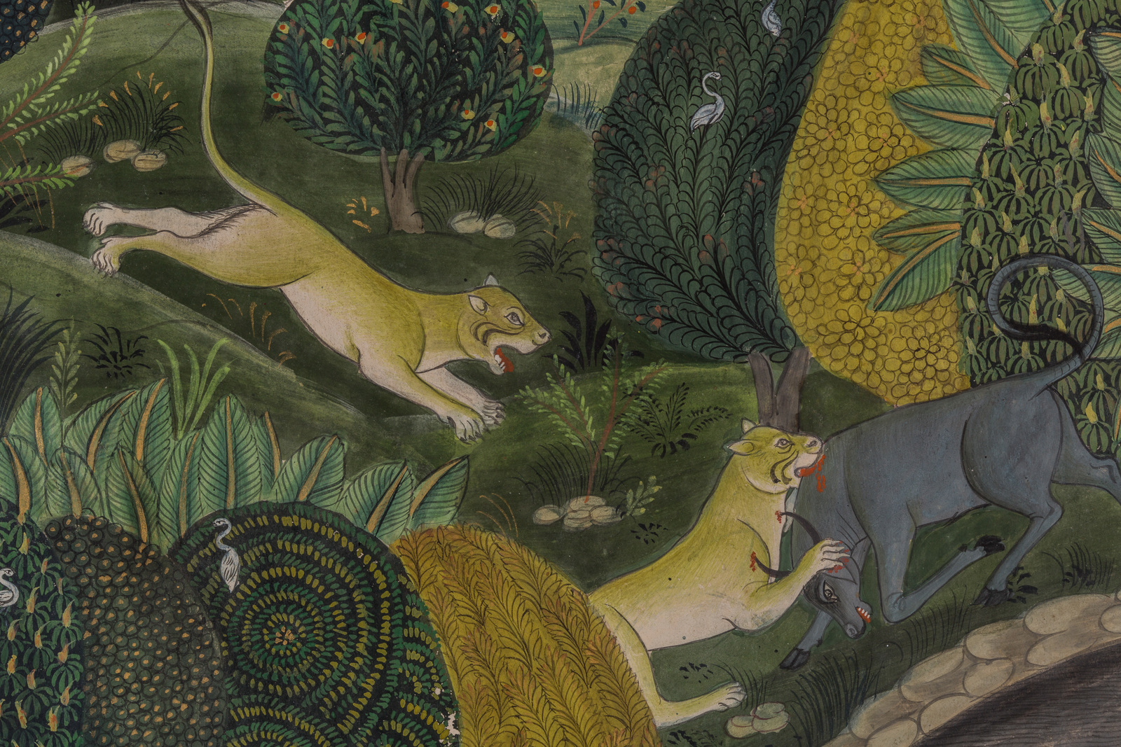Arte Indiana Grande miniatura indiana con scena di caccia alla tigre