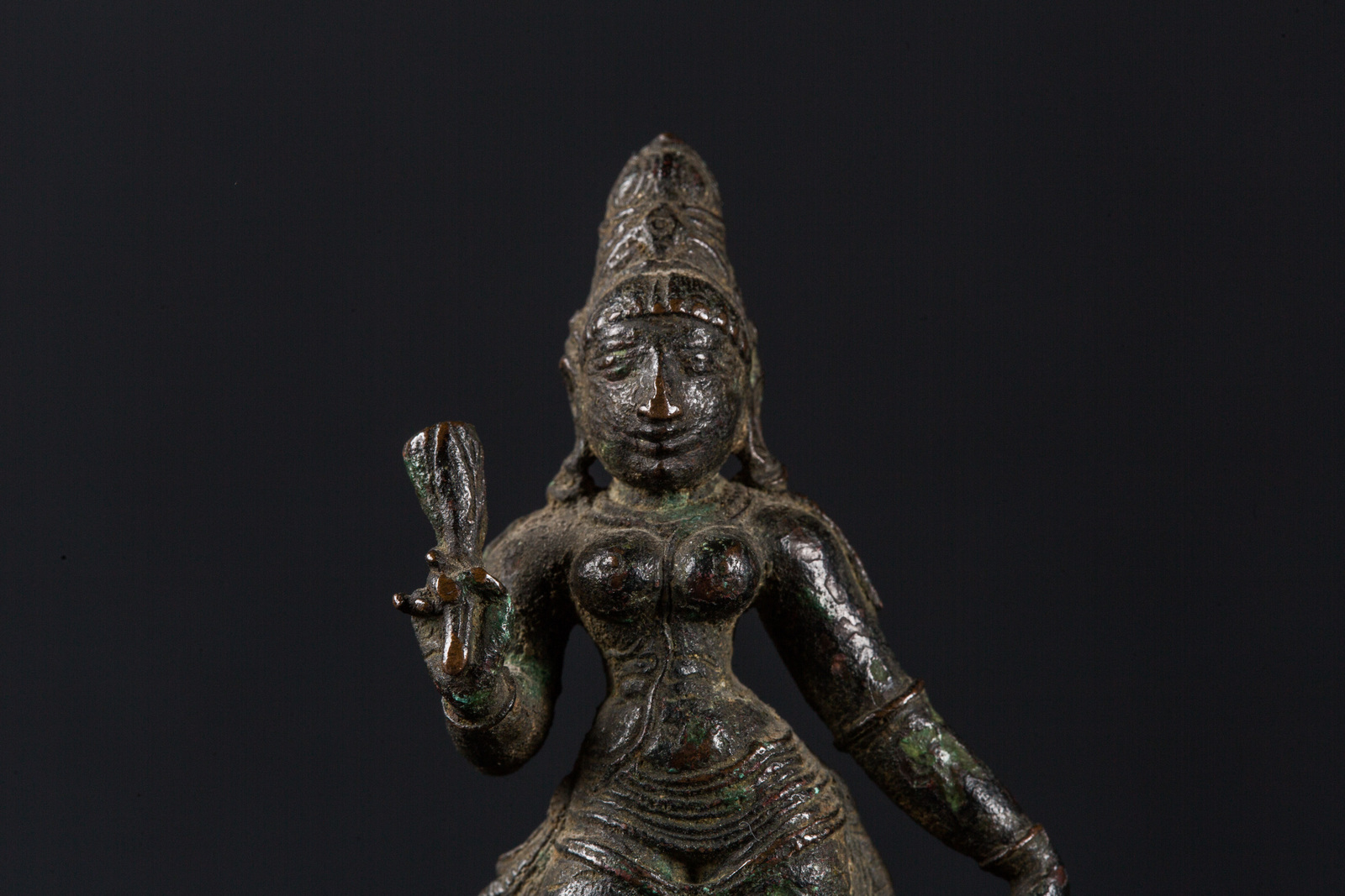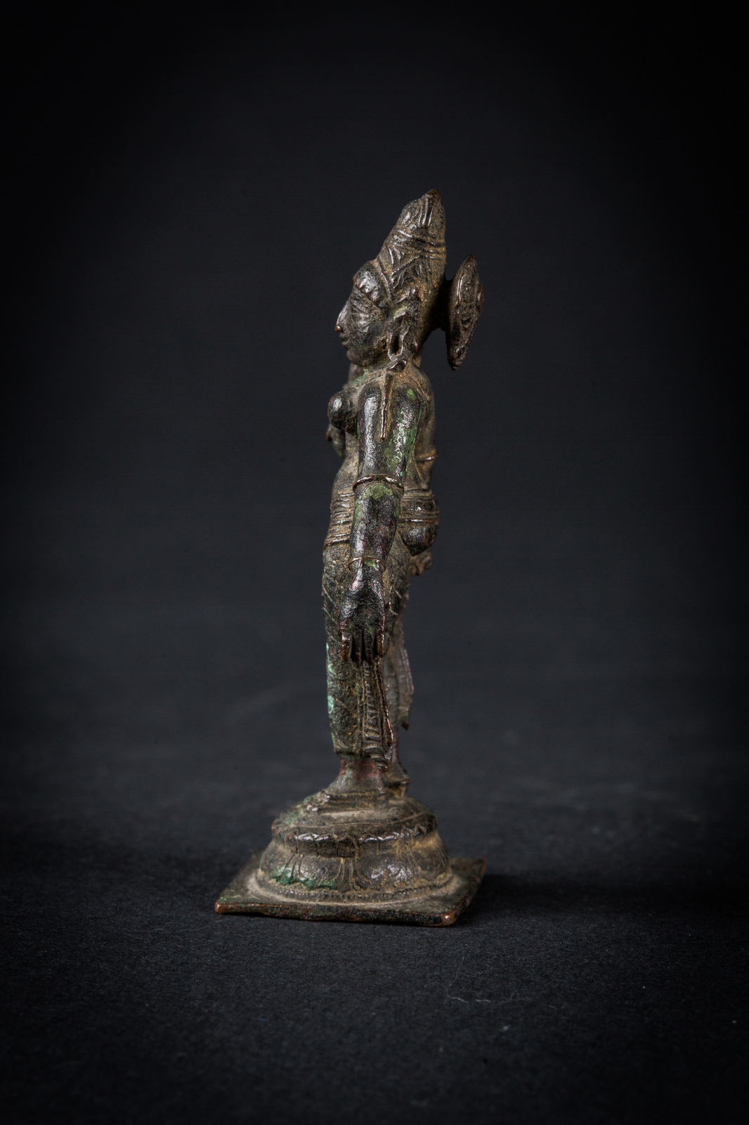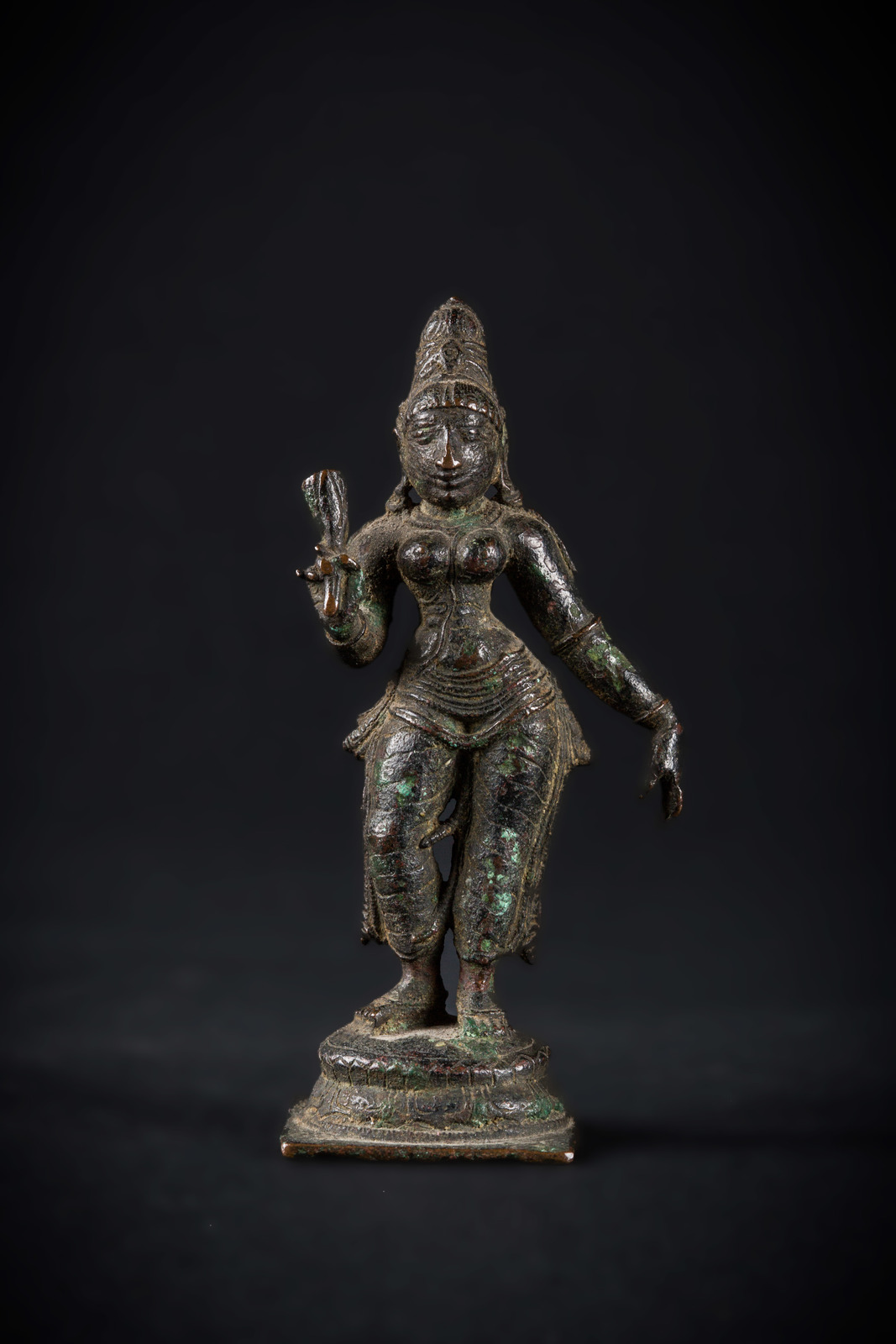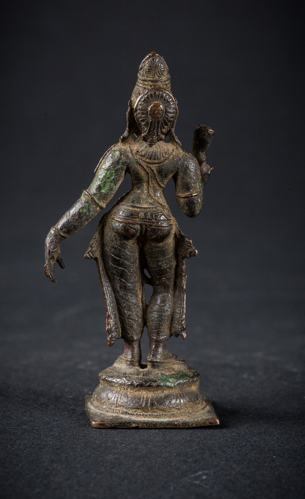 India Meridionale, periodo Chola, XII secolo . -. Cm 3,00 x 8,00. Piccola fusione ritraente la consorte di Vishnu stante su una base a fiore di loto singolo, caratterizzata da abbigliamento finemente realizzato, nella mano sinistra regge un bocciolo di loto.