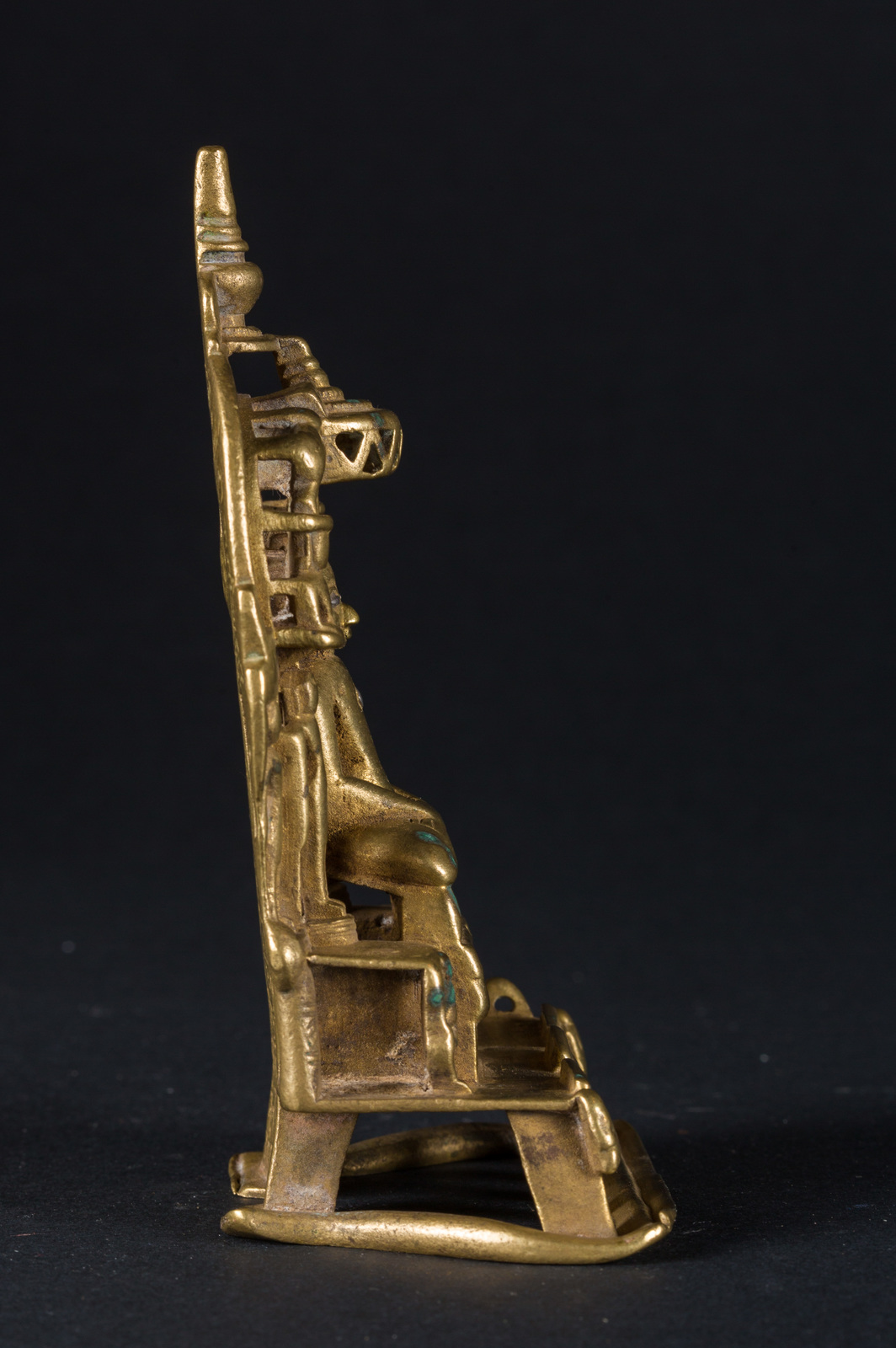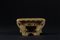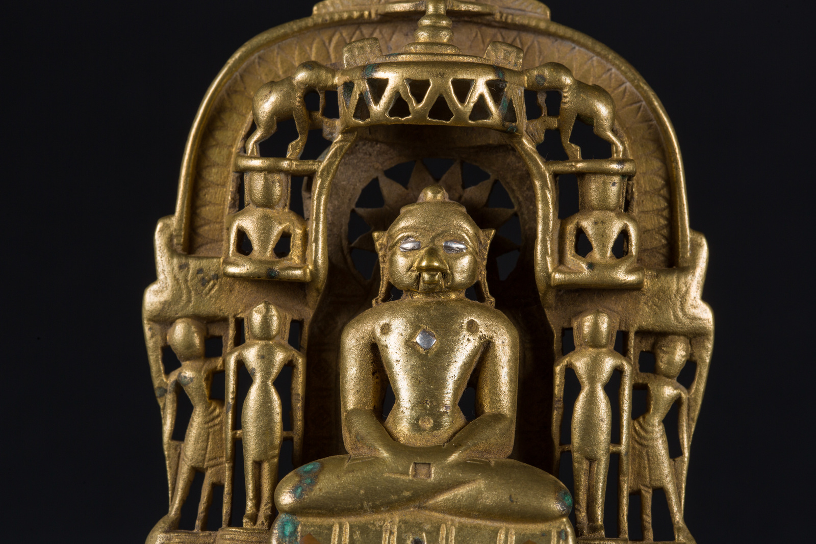 India, XVI secolo . -. Cm 8,50 x 13,00. Fusione raffigurante uno dei 24 tirthamkara seduto in padmasana su un piedistallo e con le mani giunte nella posizione dhyanamudra. L'opera presenta intarsi in rame e argento. intorno a lui, in un gioco di traforo, sono raffigurati otto personaggi secondari e quattro animali.