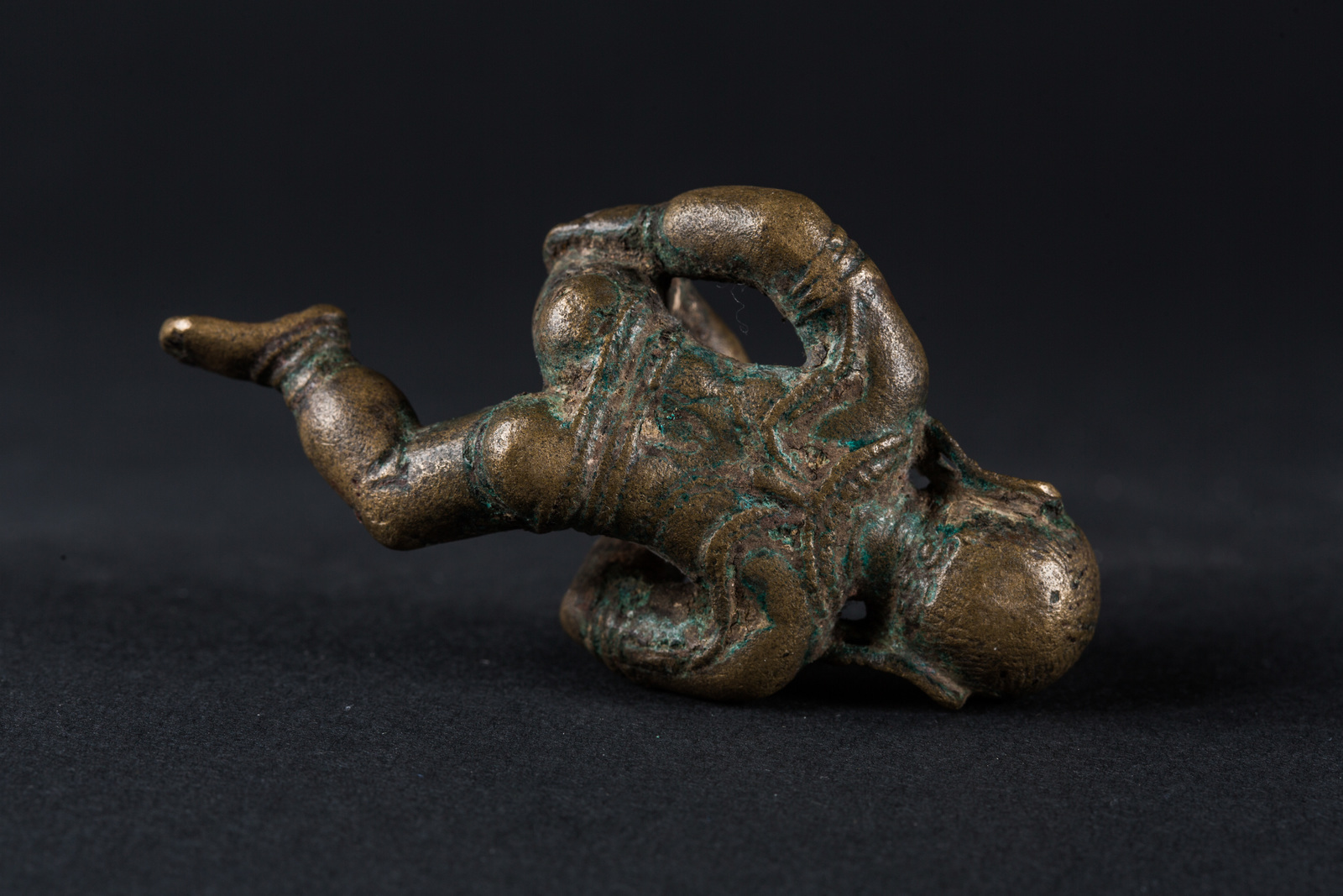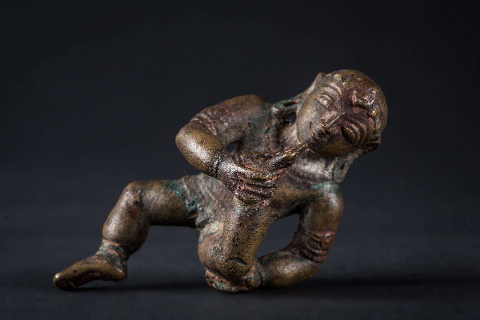 India meridionale, periodo Chola, XII secolo . -. Cm 4,50 x 9,00. Fusione in bronzo raffigurante Krishna bambino che, in una rara rappresentazione, si porta il piede sinistro alla bocca.