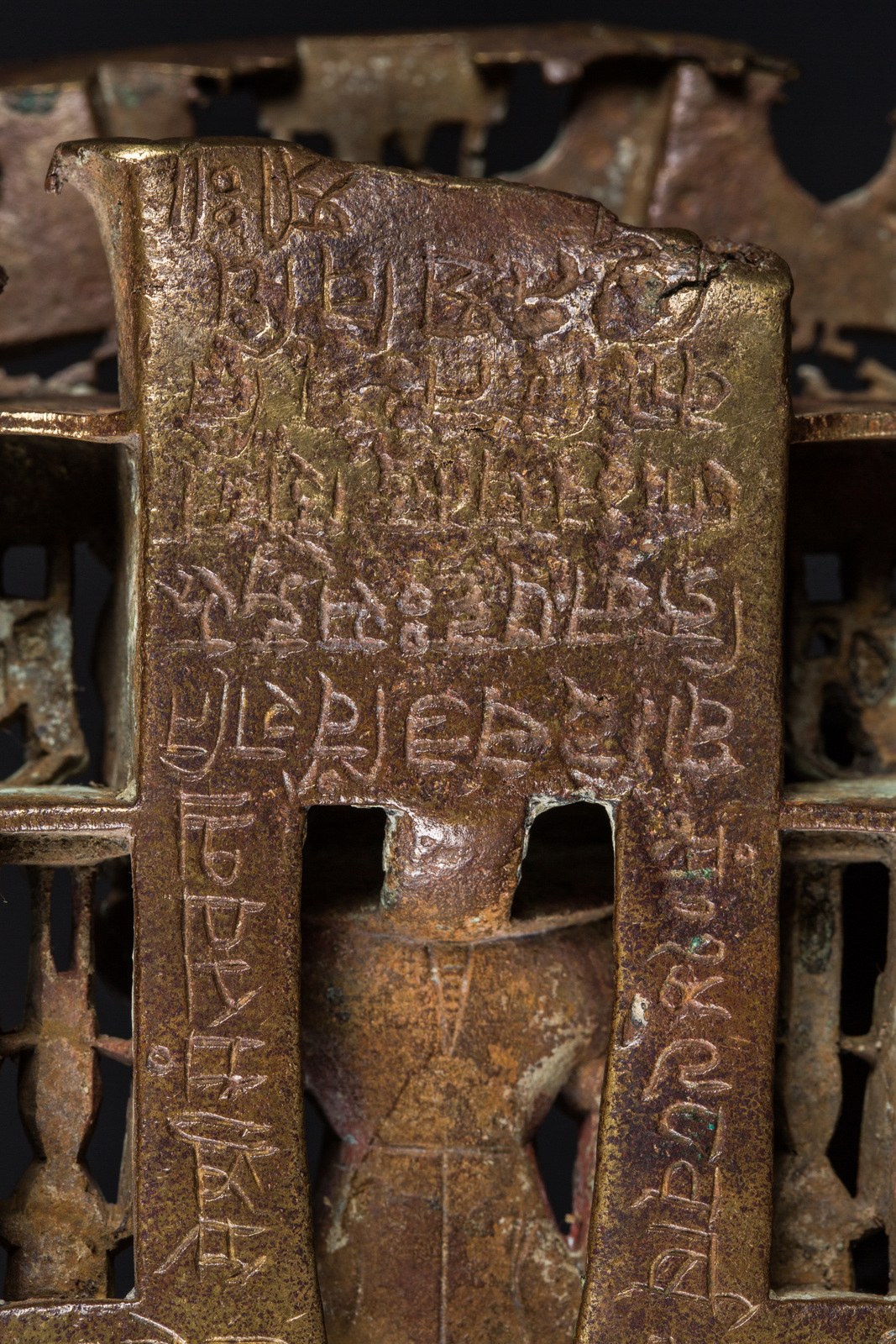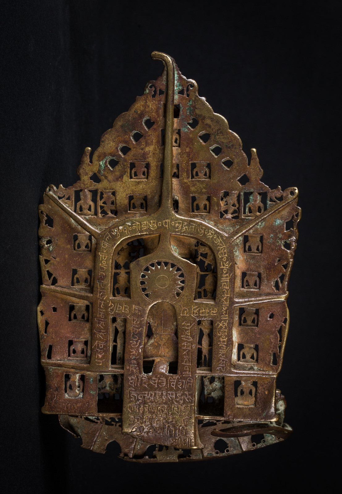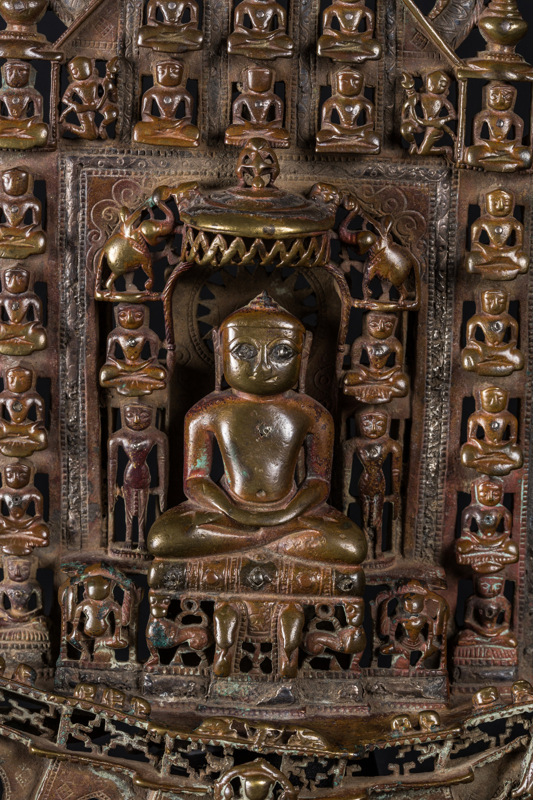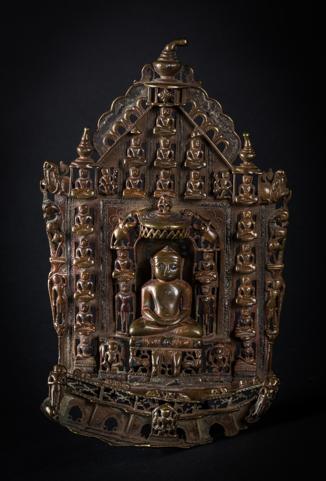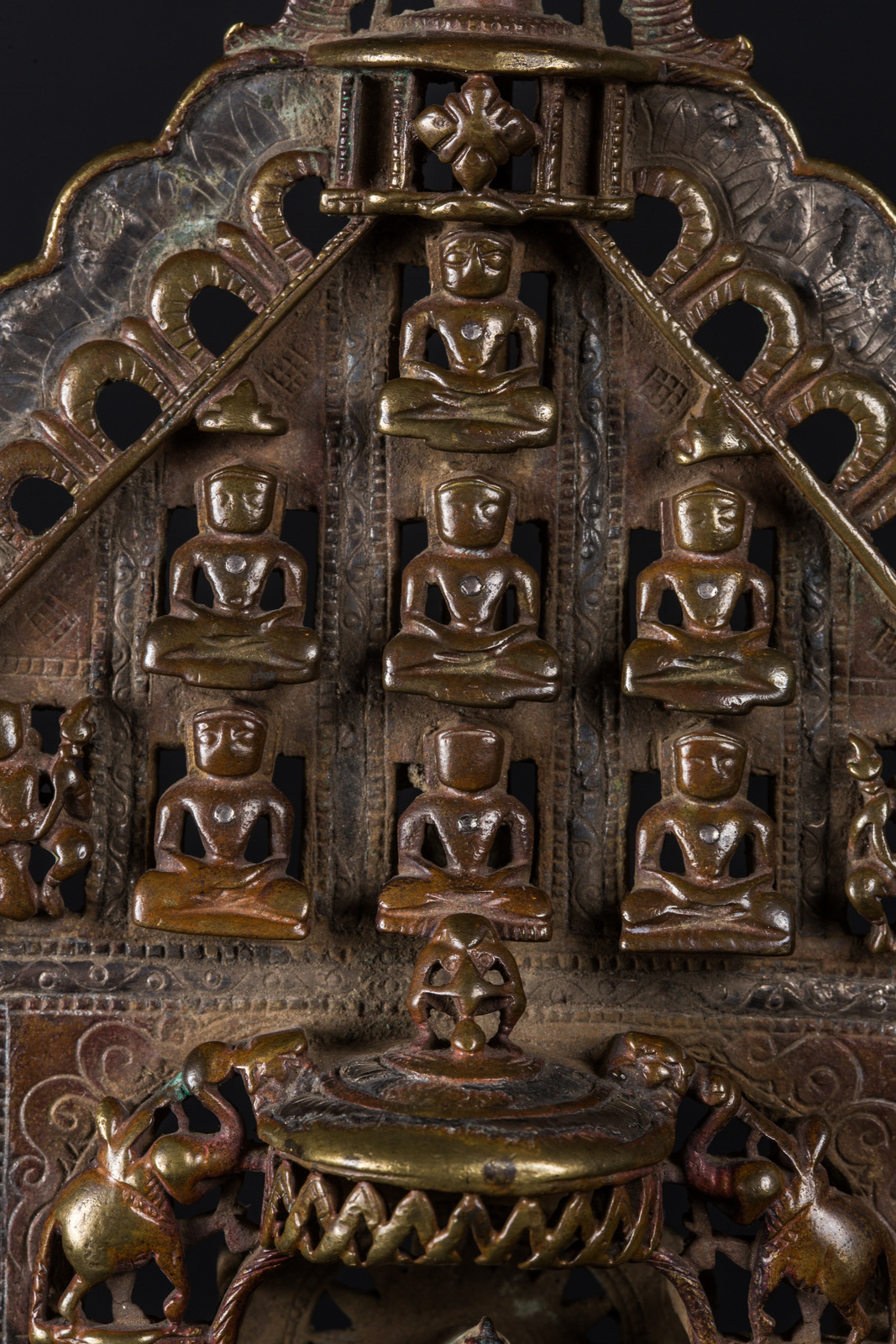 India, XVII secolo. -. Cm 17,00 x 27,00. Altare jainistain bronzo, rame ed argento raffigurante il terzo tirthamkara della religione giainista seduto in posizione padmasana all'interno di una nicchia con le mani nel gesto di meditazione dhyanamudra. Intorno alla figura principale è presente un'ampia prabha con raffigurati i rimanenti 23 profeti e animali e personaggi secondari a decorare l'opera.