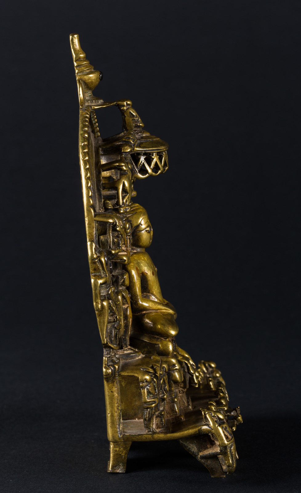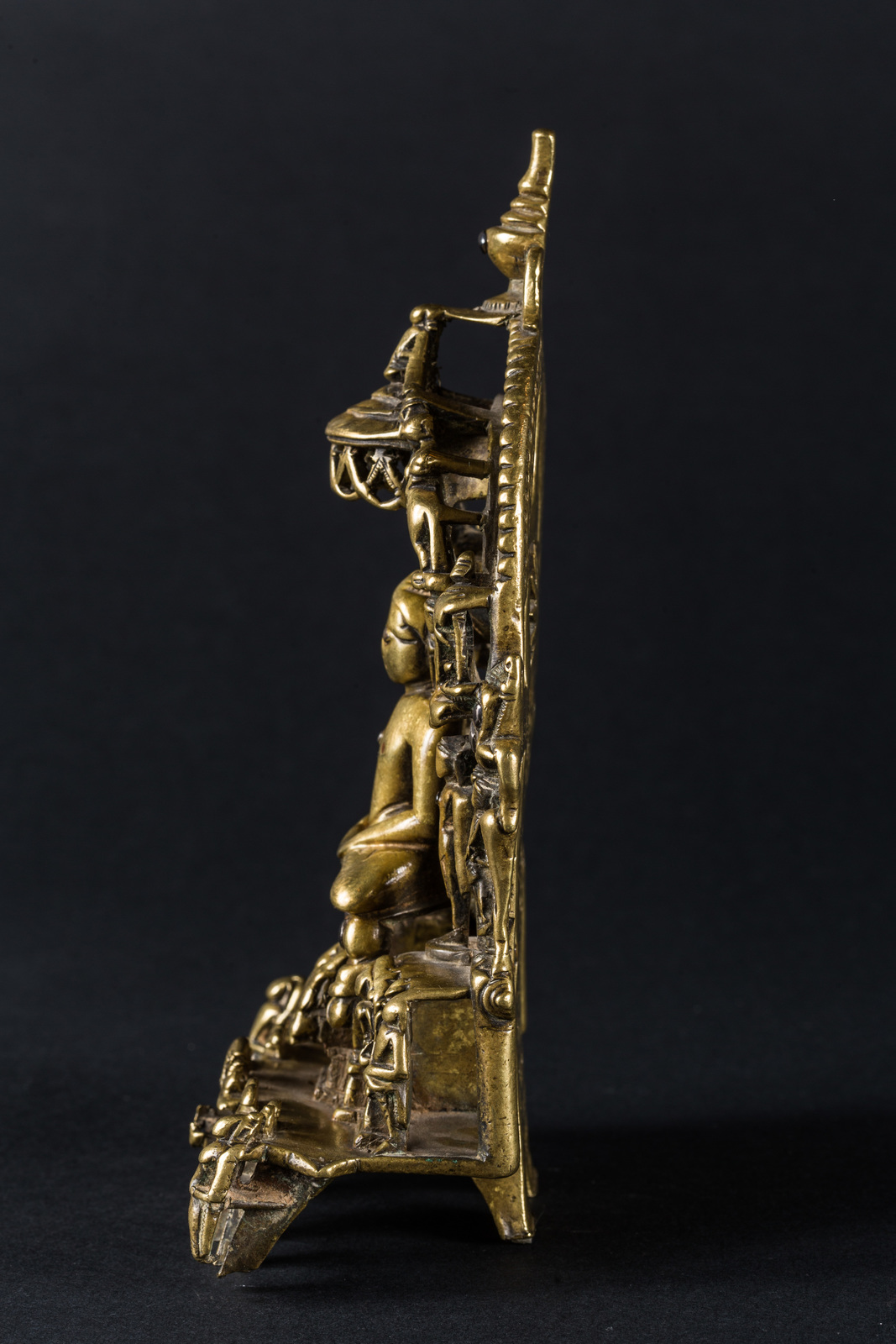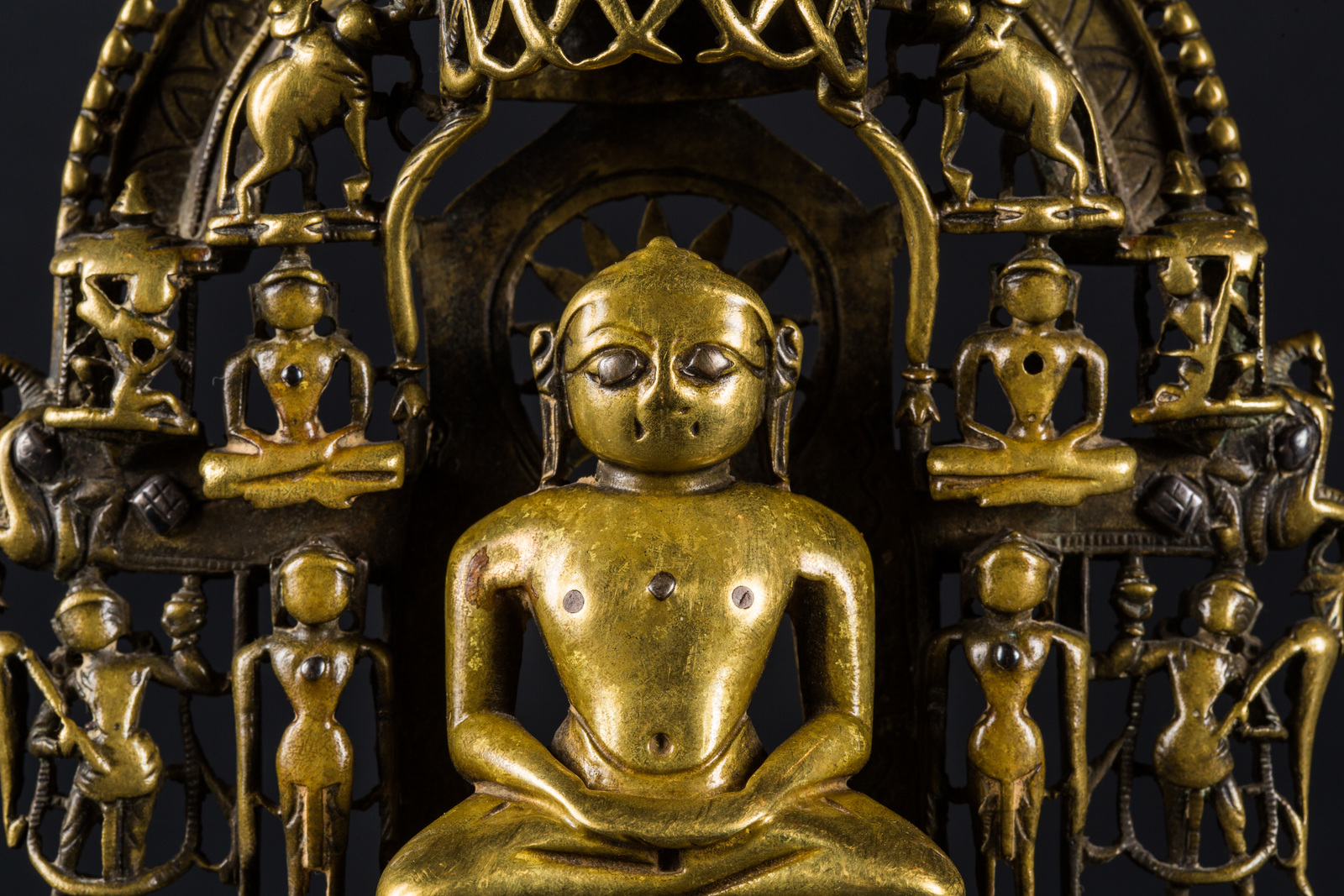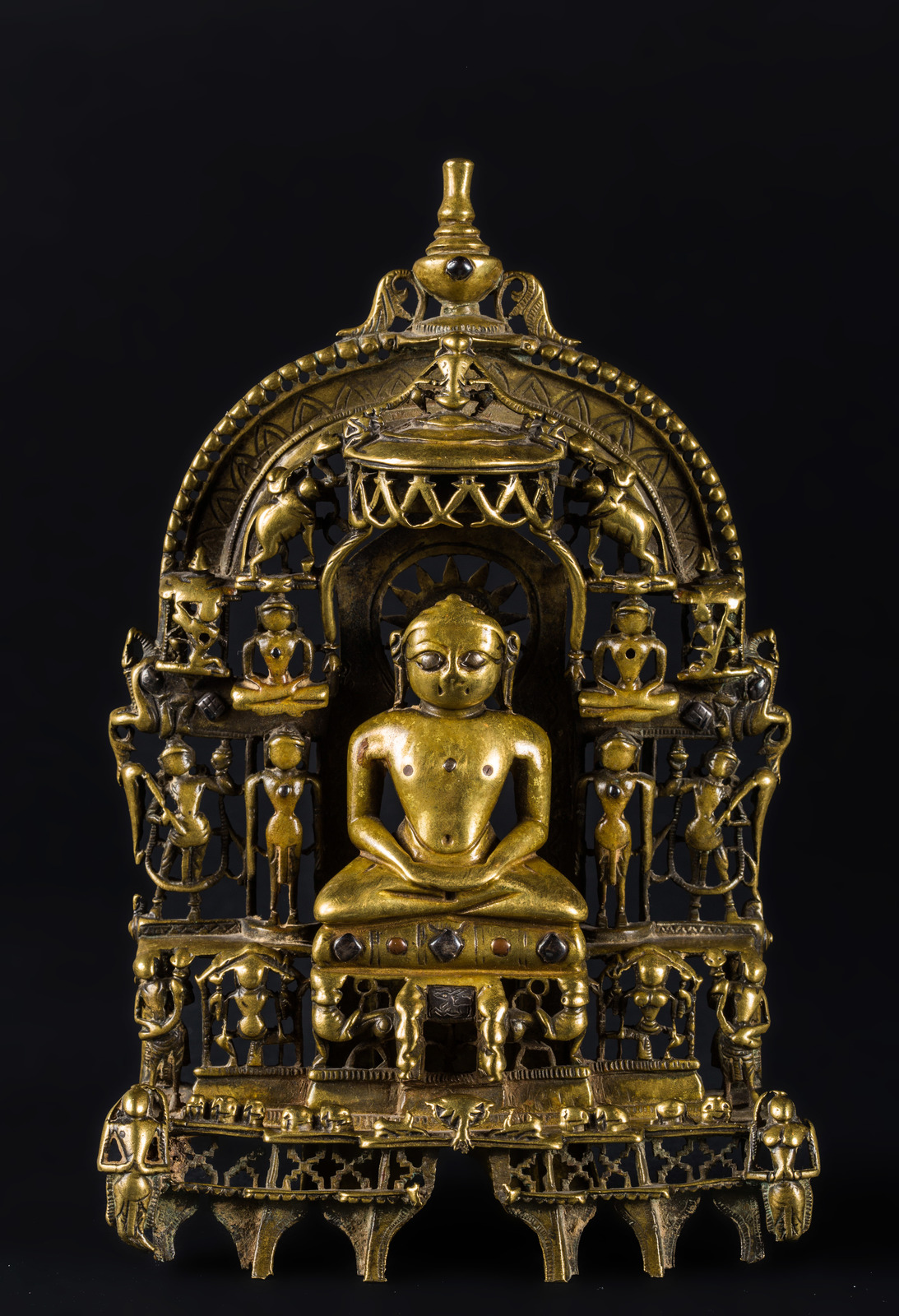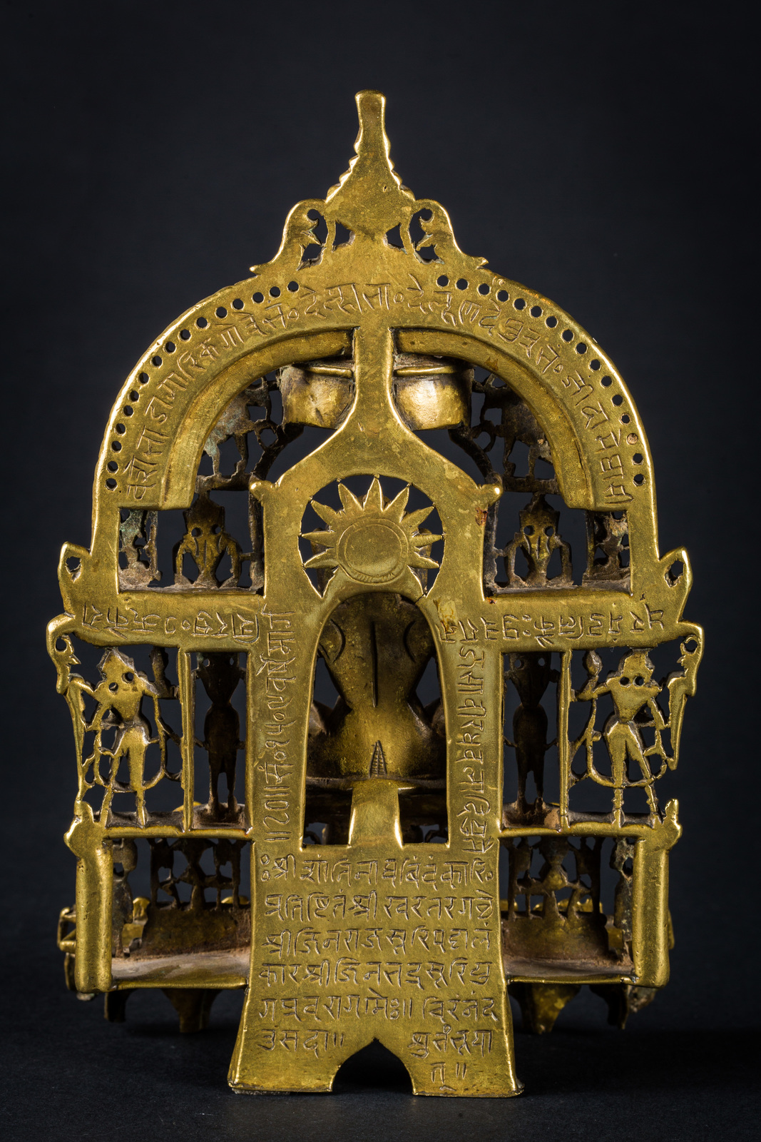 India settentrionale, XV secolo . -. Cm 13,00 x 20,00 x 6,00. Prabha in bronzo raffigurante il sedicesimo tirtankara seduto in padmasana, con le mani giunte in grembo in dhyanamudra. Intorno alla figura principale sono ritratti, in un gioco di traforo, altri quattordici personaggi, disposti in tre ordini, in atteggiamento meditativo o stanti. Il retro riporta una lunga iscrizione.