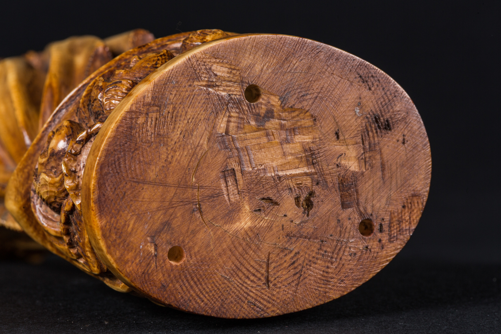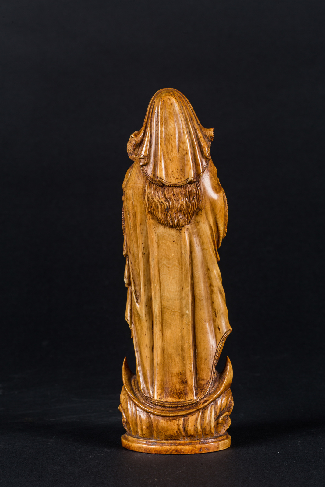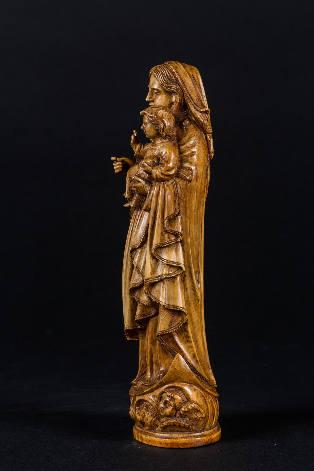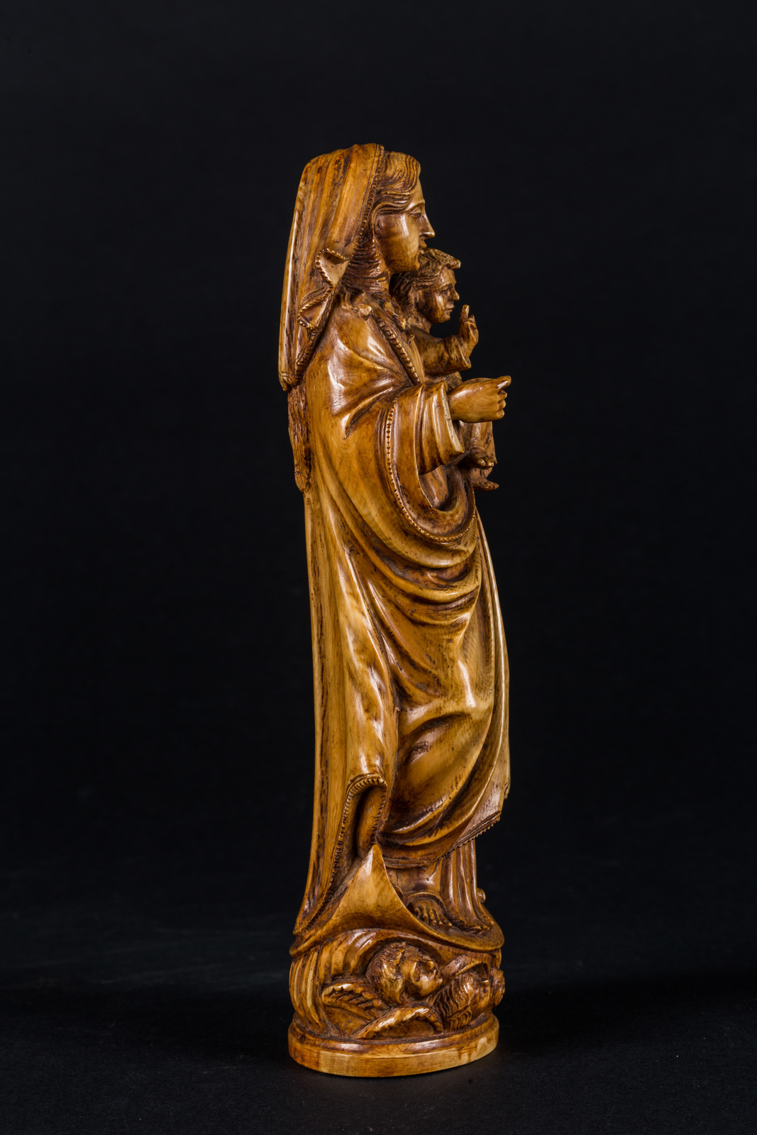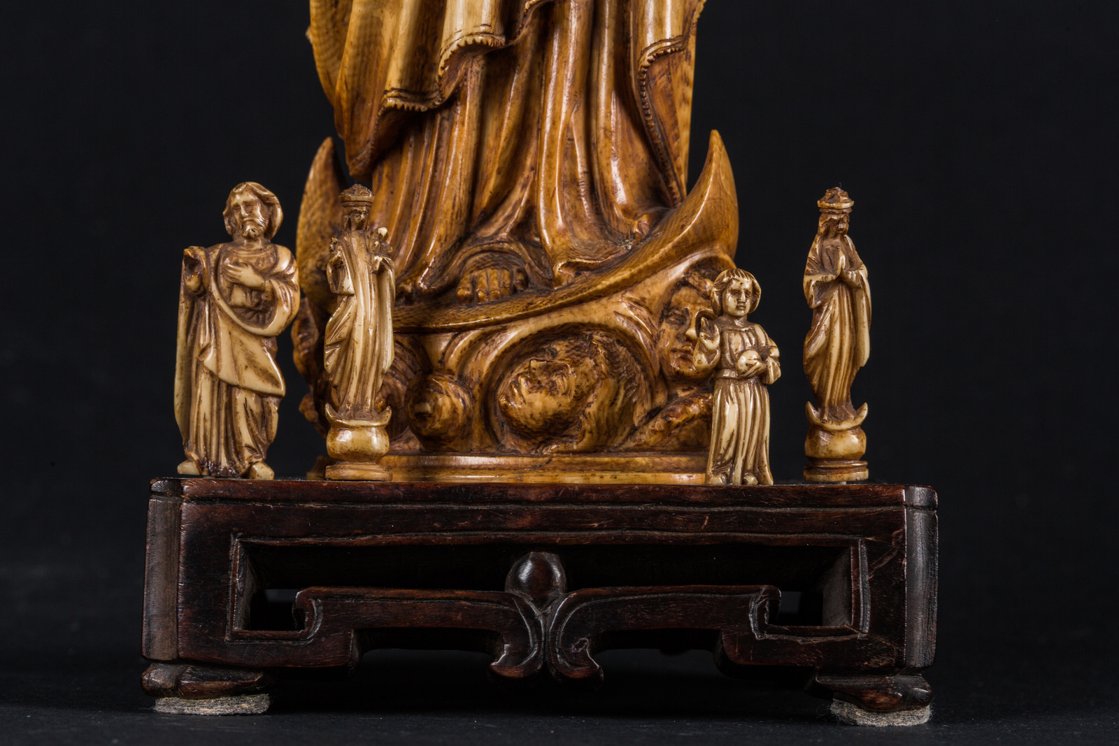 India, Goa, XVII-XVIII secolo . -. Cm 24,50. Pregevole intaglio raffigurante la Vergine Maria stante su un'elaborata base a nuvola con angeli che a sostengono. La figura tiene con il braccio sinistro Gesù bambino benedicente. Sulla base in legno coeva, quattro piccole figure di santi.