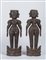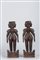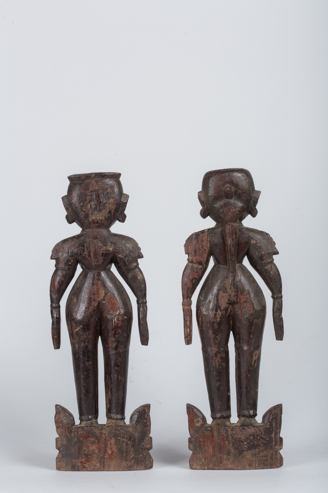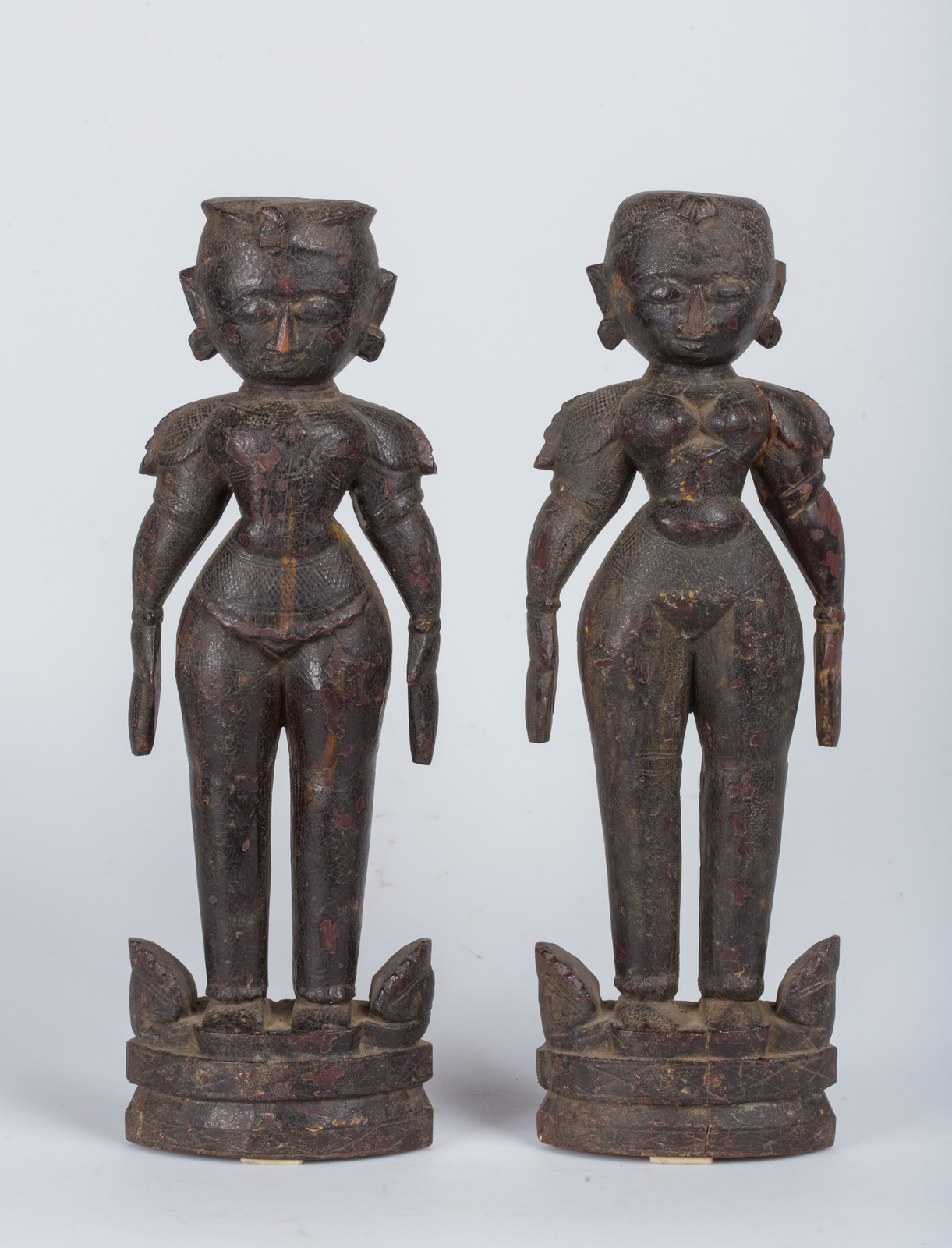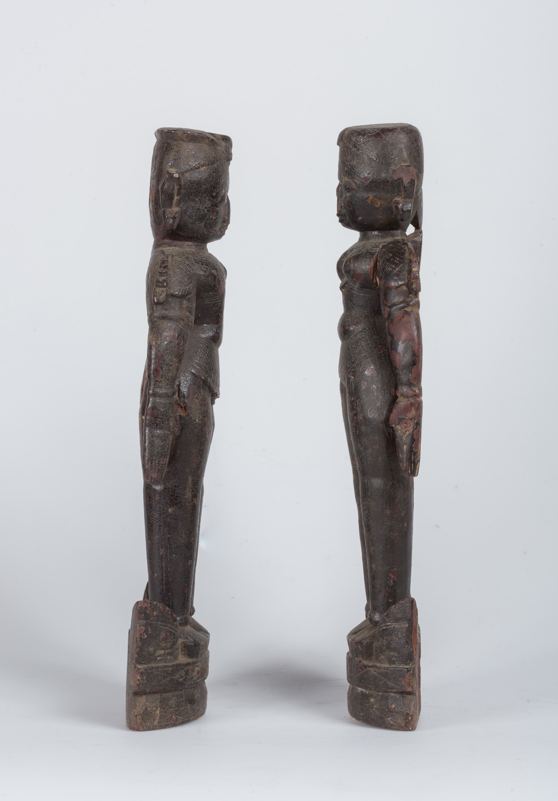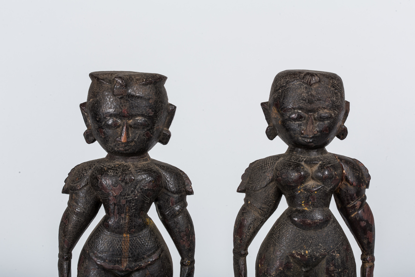 India Meridionale, Tamil Nadu, fine XVIII - inizio XIX secolo . -. Cm 13,00 x 39,00. Realizzati in legno scuro patinato e ritratti in postura stante. La raffigurazione a braccia stese lungo i fianchi è tipica del Tamil Nadu.