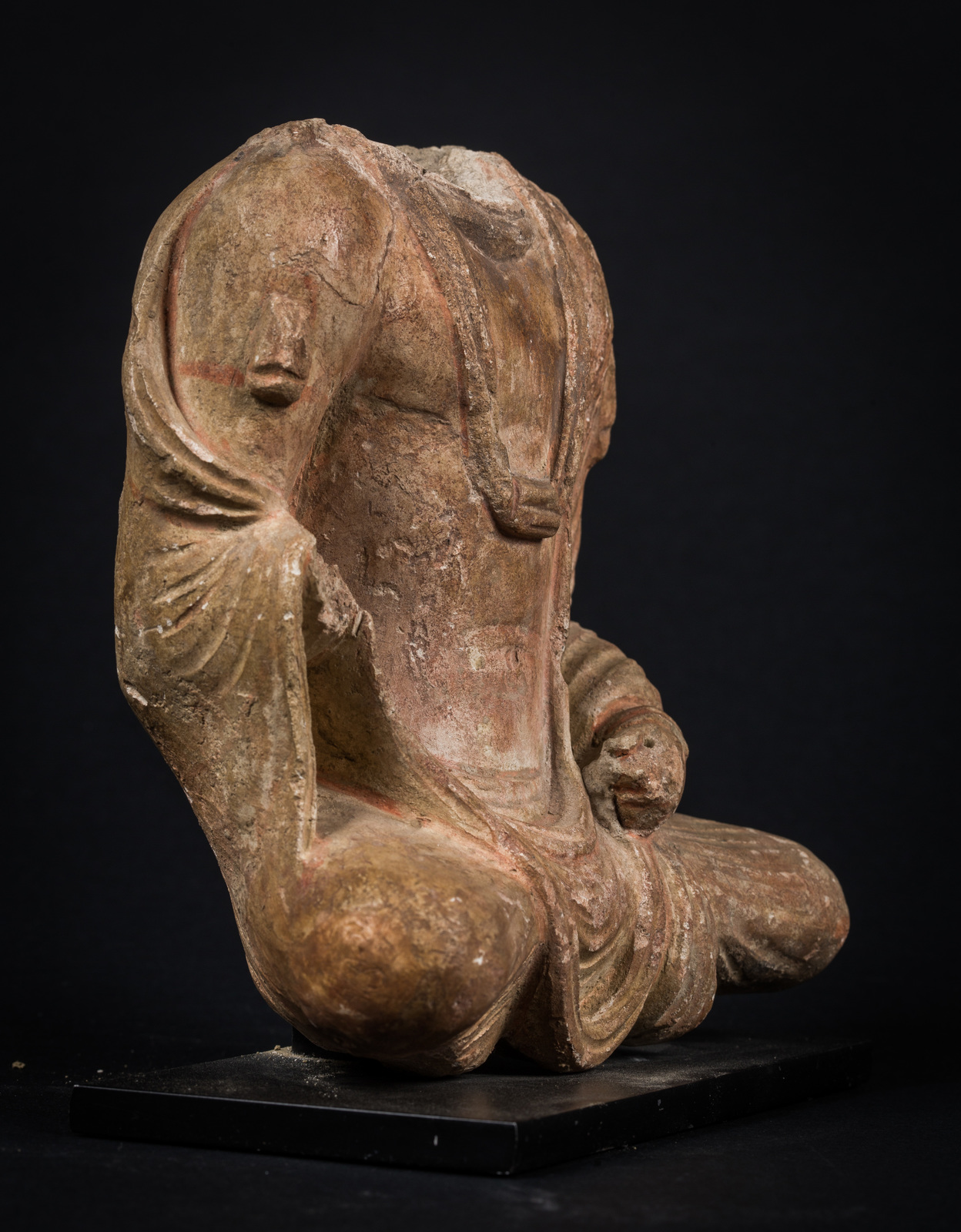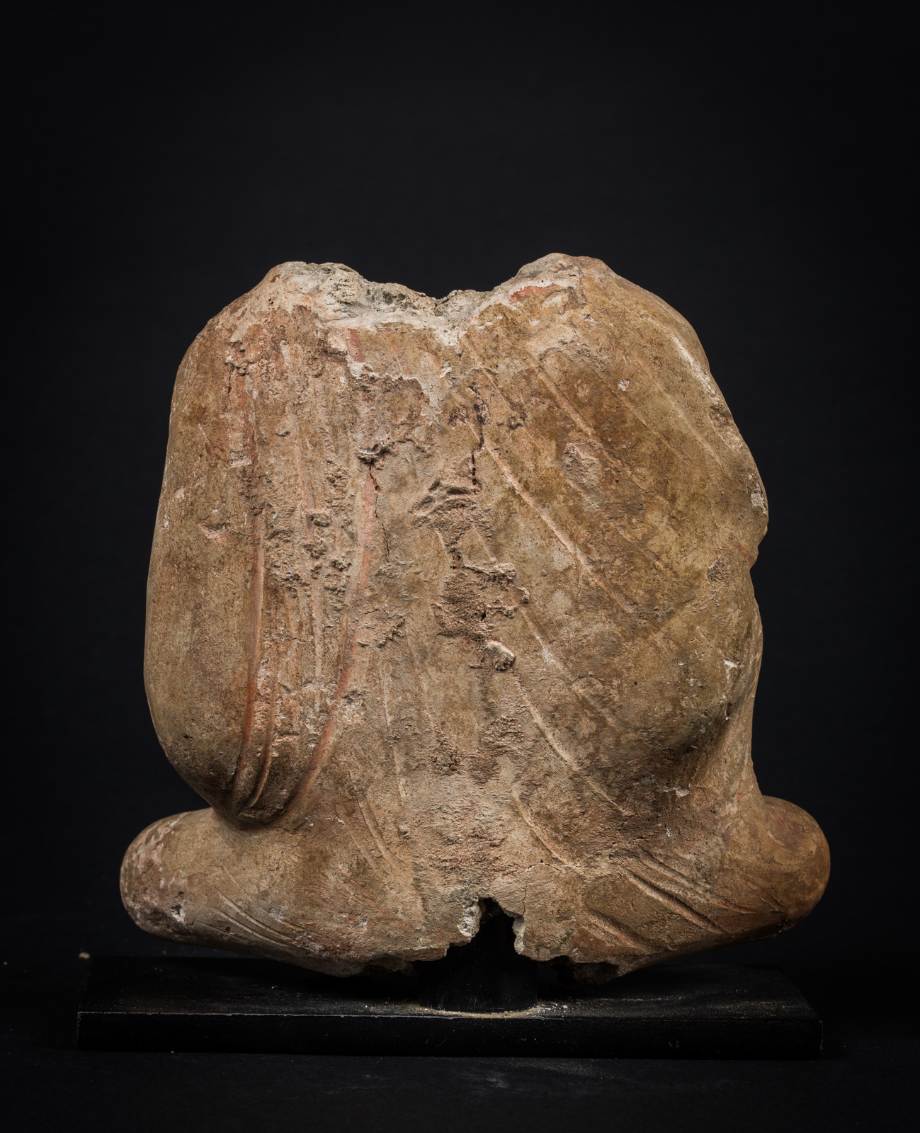 II - VIII secolo d.C. -. Cm 17,00 x 16,00 x 8,00. Raffigurante probabilmente un bodhisattva abbigliato con dothi dai morbidi panneggi ed una collana.
