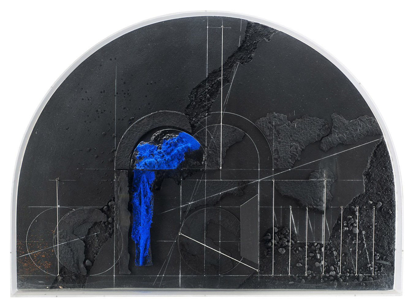tecnica mista e assemblage di legni su tavola in teca di plexiglass, cm 65x90x11