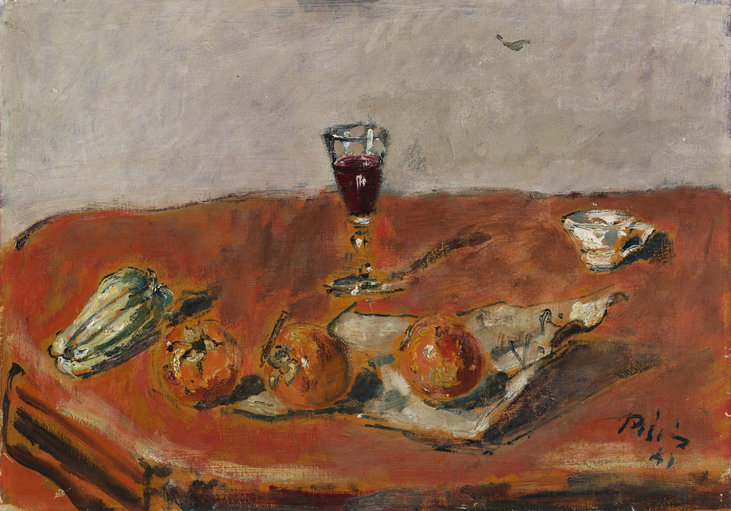 Filippo De Pisis (Ferrara 1896 - Milano 1956)"Natura morta con tovaglia rossa e bicchiere" 1941