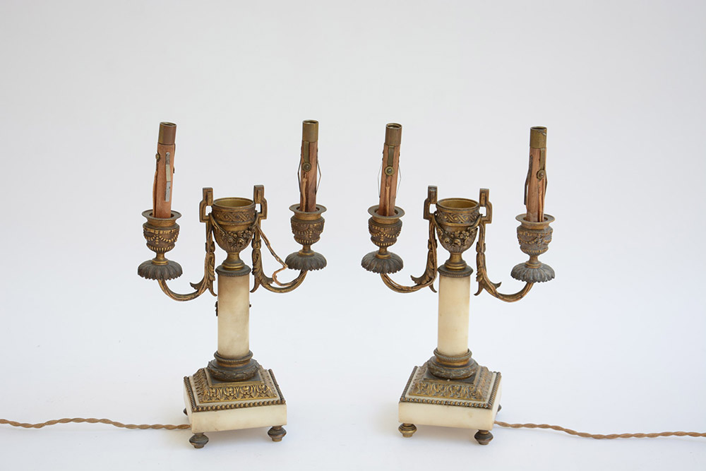 Coppia di candelieri a due fiamme in alabastro e bronzo a forma di colonna sormontata da vaso. Applicazioni, ghiere e perlinatura in bronzo (h. cm 22) (difetti e mancanze, montati a luce elettrica in epoca posteriore)