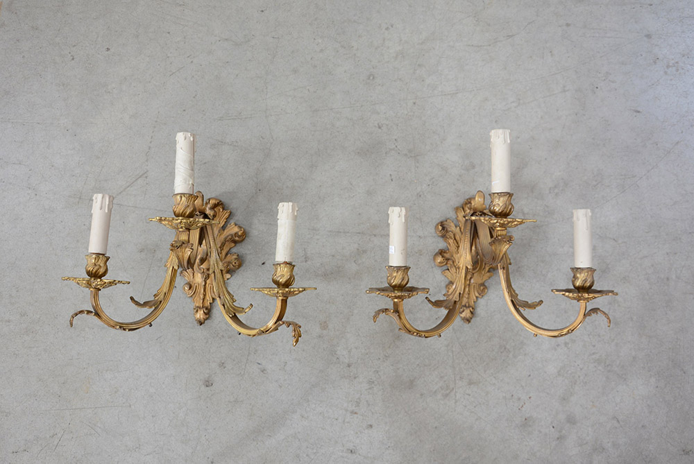 Coppia di appliques a tre luci in bronzo dorato decorato a motivi vegetali