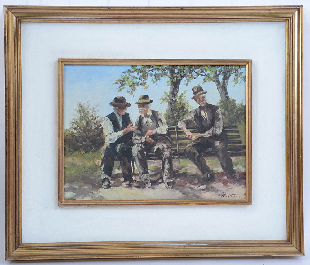 Testa Peppino "Tri umètt in su la banchetta" olio su tela (cm 30x40) firmato in basso a destra, titolato e firmato al verso, in cornice (lievi difetti)