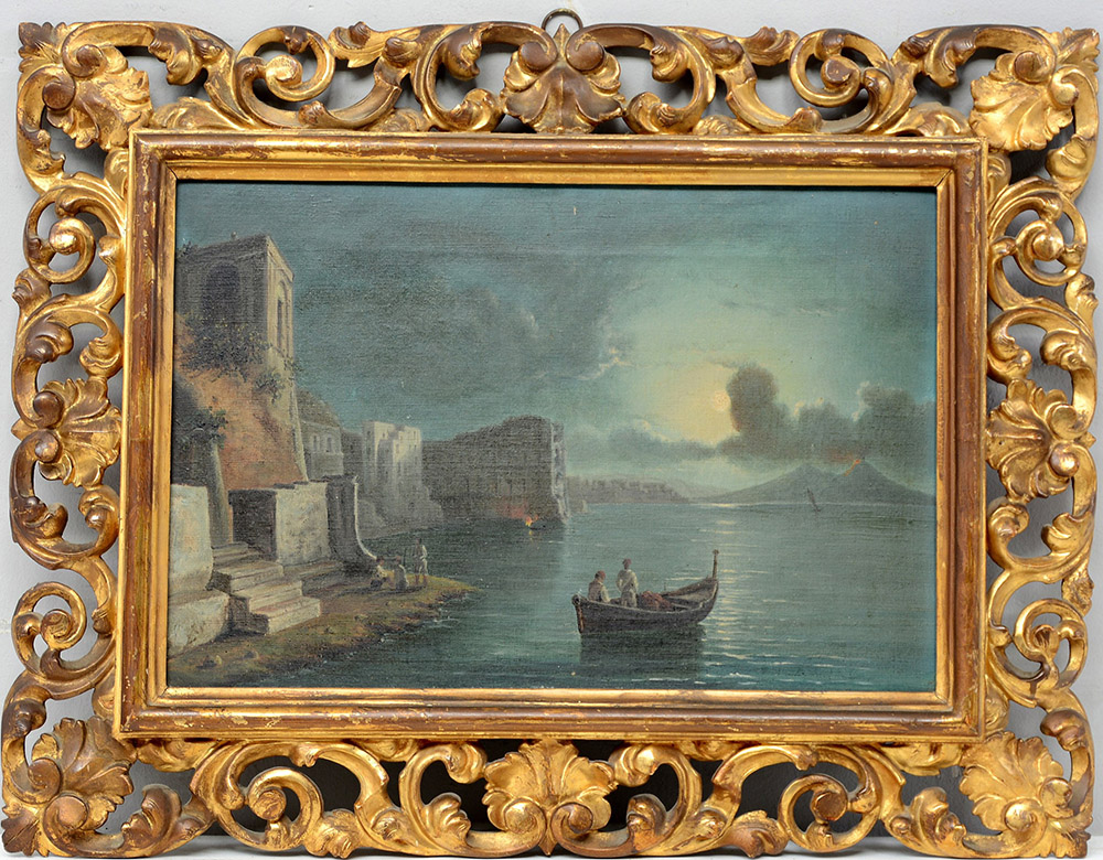 Ignoto "Notturno col golfo di Napoli e il Vesuvvio". Olio su tela (cm 26x38) in cornice intagliata e dorata