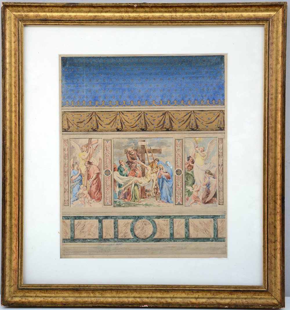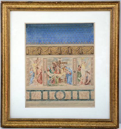 Maestro del sec. XIX "Studio per decorazione con Deposizione dalla Croce" acquarello su carta (cm 41x34) In cornice