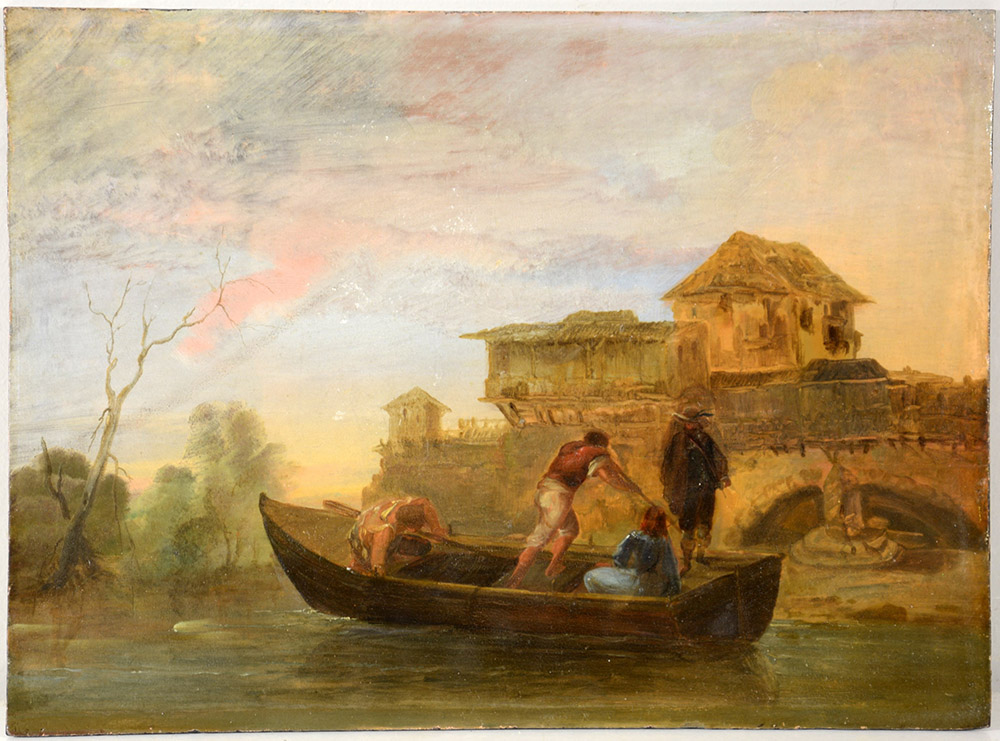 Maestro Veneto fine sec XVIII "Paesaggio fluviale con barcone e viandanti" olio su tavola (cm 28x38)