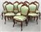 Gruppo di otto sedie in legno di forma sagomata con cimasa intagliata a volute vegetali, gambe anteriori mosse munite di rotelle