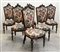 Gruppo di sei sedie in noce con cimasa scolpita a nastri e frutti. Rivestite in tessuto a fiori. Sec. XIX (difetti)