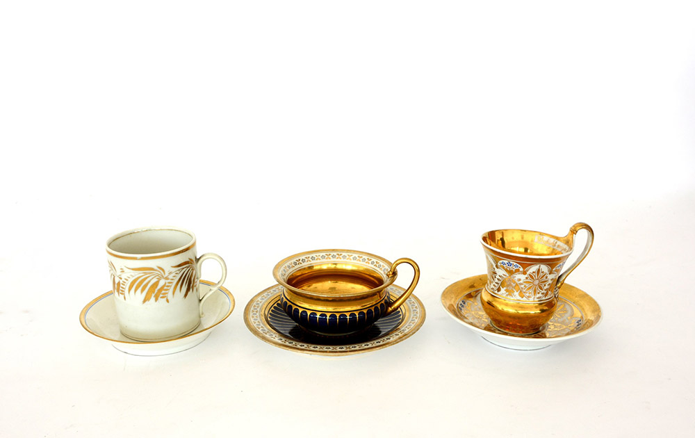 Manifatture diverse fine sec. XIX. Tre tazze con piattini in porcellana decorate nei toni del blue e dorature a motivi stilizzati (difetti e restauri)