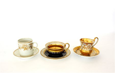 Manifatture diverse fine sec. XIX. Tre tazze con piattini in porcellana...