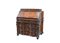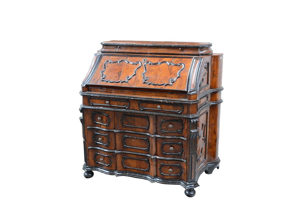 Ribalta "lombarda" lastronata in radica di noce con filettature mosse ebanizzate, fronte a tre cassetti grandi e uno piccolo e fianchi concavi, ribalta celante cassettini e vano porta oggetti (cm 114x109x60)(difetti)
