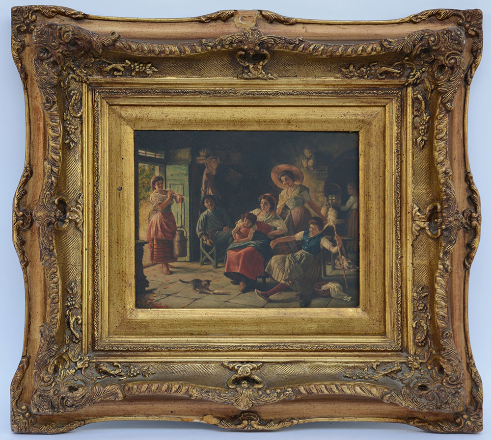 Firma indicifrata "Interno con figure" olio su rame (cm 20x25) firmato in basso a sinistra. In cornice (difetti)