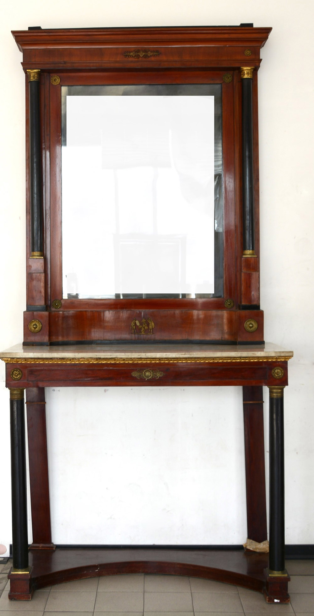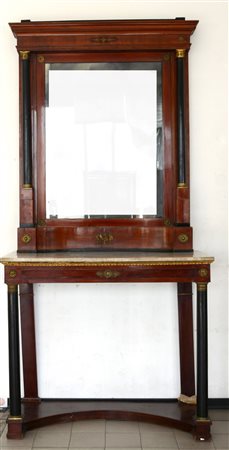 Consolle con specchiera lastronata e con montanti a piena colonna in legno tornito ed ebanizzato, capitelli in metallo dorato. Fasce decorate da fregi a volute e figure mitologiche. Piano in marmo. Sec. XIX (cm 118x240x53) (difetti)
