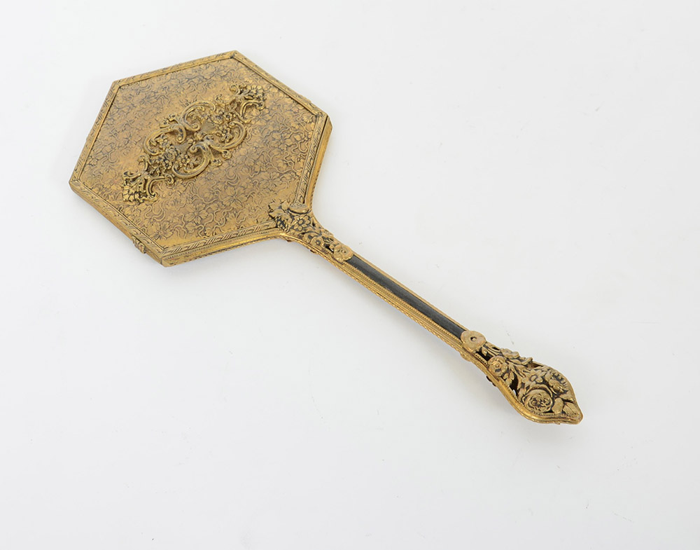 Specchio a mano esagonale da toeletta in argento dorato decorata a motivi floreali (lievi difetti)