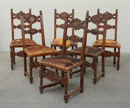 Gruppo di sei sedie in ncoe con schienale a giorno e cartelle sagomate ed...