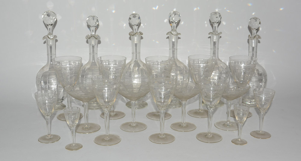 Parte di servizio di bicchieri e sei bottiglie in cristallo (difetti)