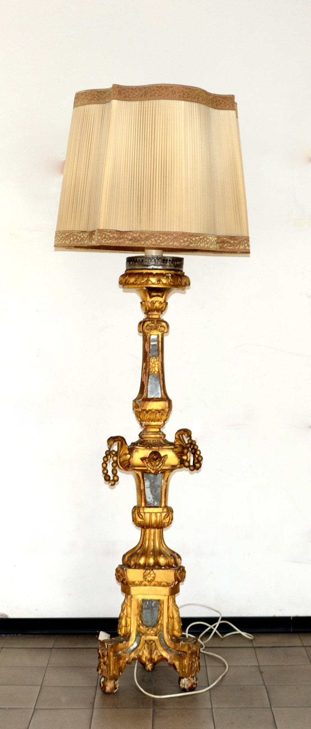 Portacero in legno intagliato e dorato a volute fogliate, festoni e teste di cherubini. Sec. XVIII (h. cm 148) (montato a luce elettrica in epoca posteriore, difetti e mancanze)