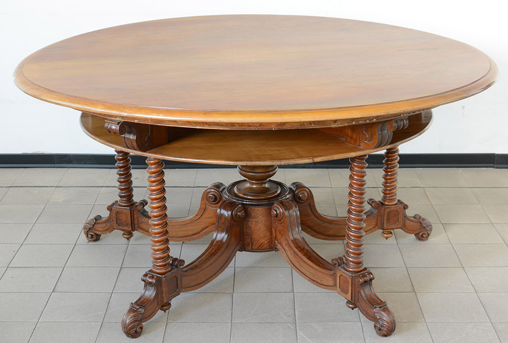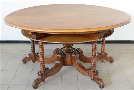 Tavolo tondo in mogano con gamba centrale tornita terminante a quattro piedi sagomati con colonne tortili. Inghilterra sec. XIX (cm d 150x75)