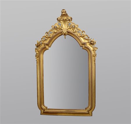Specchiera in legno dorato con cimasa applicata,scolpita e intagliata, di gusto rocaille, secolo XIX (cm 122x206) (difetti)