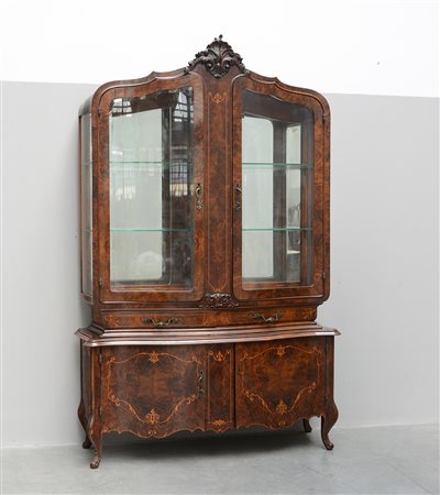 Vetrina di forma mossa a due corpi lastronata in radica e filettata in legno chiaro, parte superiore a due ante a vetri e cassetto nella fascia. Parte inferiore a due sportelli. Piedini sagomati (cm 142x230x48)