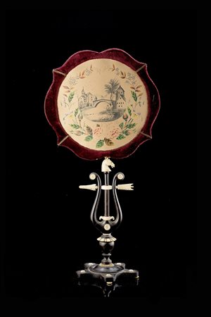 Arte del sec. XIX. Ventola in carta dipinta a paesaggio con ponte poggiante su base in legno ebanizzato a forma di lira con fregi in avorio (h. cm 48) (difetti)