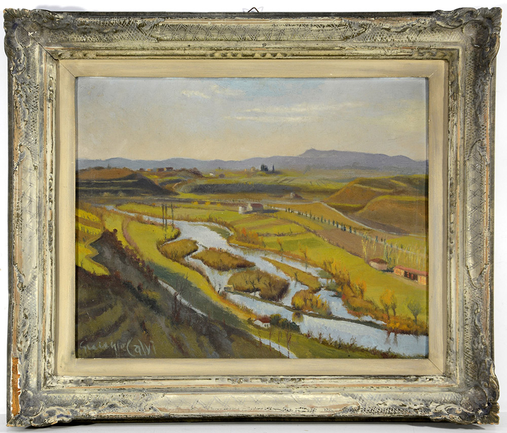 Giuseppe Calvi Oreglia 1895 1983 " Valle del Mincio" olio su cartone telato (cm 40x50) firmato in basso a sinistra. Firmato e titolato al retro, in cornice
