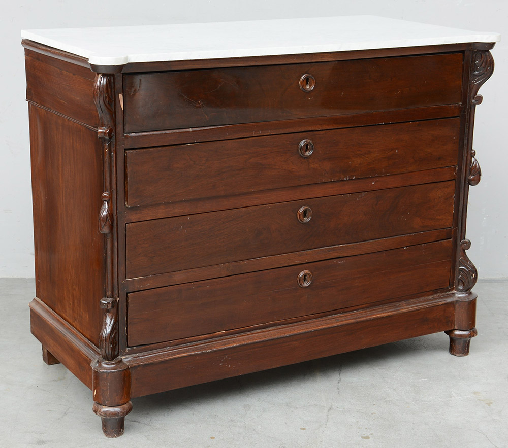 Comò a quattro cassetti sul fronte con montanti intagliati a frutti e motivi vegetali. Piano in marmo, fine sec. XIX
