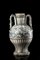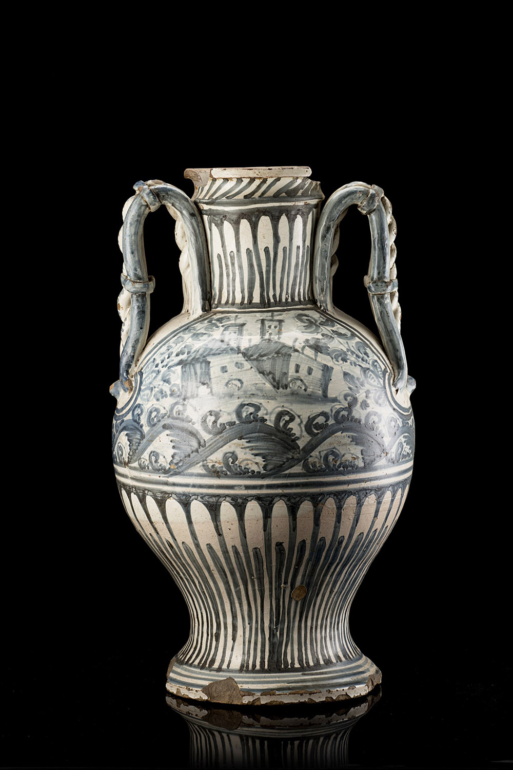 Grande vaso a forma di anfora in maiolica decorato in monocromia blu. Due anse foggiate a doppia corda. Decorazione sul collo e sull’alto piede a baccellature mentre sul davanti è dipinta un’ampia riserva con paesaggio rurale e case. Italia meridionale, sec. XVII/XVIII (h. cm 44) (difetti e mancanze)